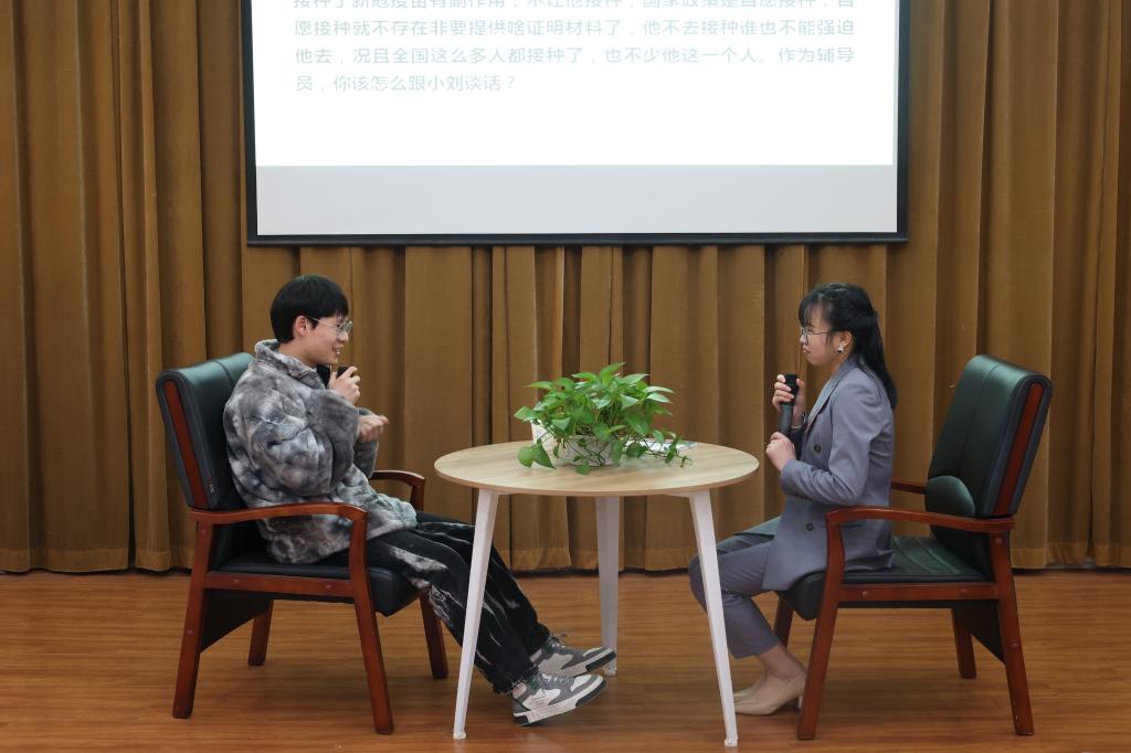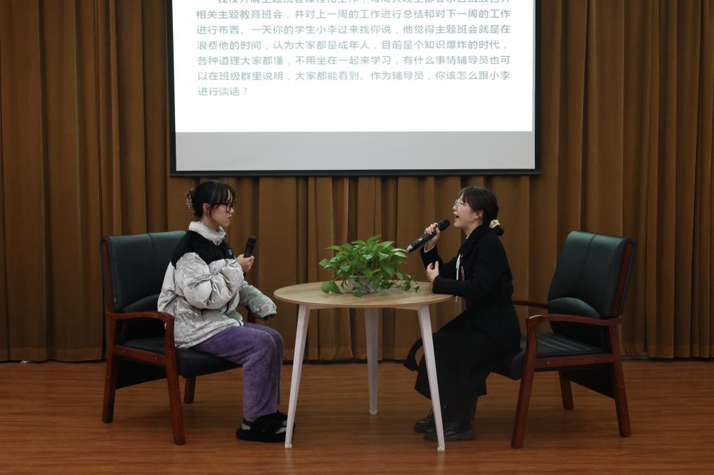 谈心谈话以现场情景再现的方式进行,主要考察辅导员对学生特征、学生成长成才规律的了解把握程度,对学生的教育引导能力、解决实际问题的能力等。参赛选手提前10分钟抽题,随后与学生进行现场谈心谈话。谈话结束后,选手需结合谈话情况进行简短总结,分析谈心谈话的解决思路及重、难点等。谈心谈话的内容涉及学生思想引领、日常管理、学风建设、资助育人、心理危机干预、就创业指导等多个方面。一个个棘手的问题,一件件重要的“小事”,一次次的迎刃而解,12名参赛辅导员围绕情景准确把握问题核心,谈话过程随机应变、有条不紊,充分展示了我校辅导员热情的工作状态、百变的工作技巧和扎实的工作能力,现场不时爆发出会心的笑声与掌声。