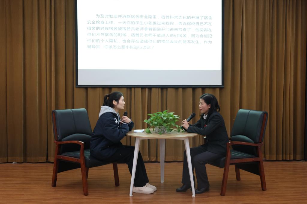 作为学校辅导员队伍建设中的一项专项赛事,辅导员素质能力大赛历时一个多月,分为初赛、复赛、决赛三个阶段,设置理论知识测试、案例研讨、谈心谈话等环节。经过初赛和复赛的激烈角逐,最终共有12名选手进入决赛(谈心谈话环节)。