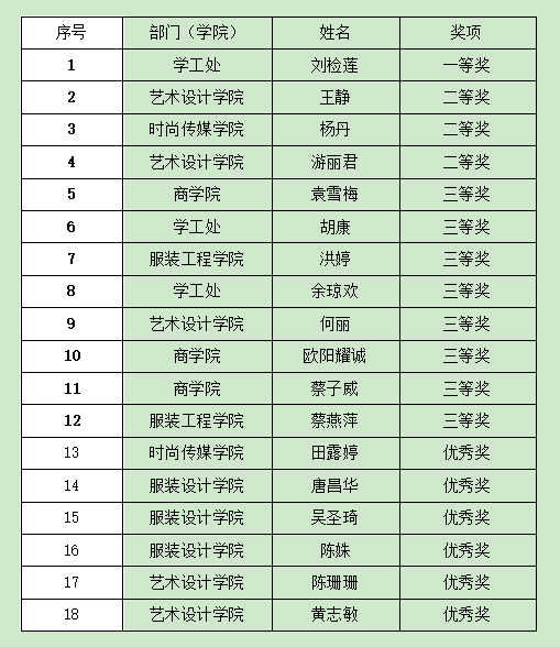 经过激烈角逐,综合评比,刘检莲荣获一等奖,王静、杨丹、游丽君等3人荣获二等奖,袁雪梅等8人荣获三等奖,田露婷等6人荣获优秀奖,据悉,获奖人员将代表学校参加2022年全省辅导员素质能力大赛。
