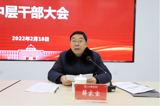 校长薛家宝提出2022年工作要点:坚持以习近平新时代中国特色社会主义思想为指导,认真贯彻党的十九大及历次全会精神,全面落实立德树人根本任务,以“三步走”战略为指引,以学科建设为龙头,以时不待我的紧迫感和功成必定有我的责任感,对标申报条件,创新工作思路,真抓实干出成绩,以优异的成绩迎接党的二十大胜利召开。薛家宝要求全校上下重点突出五项对标着力推动五个明显提升并责任到人落实到岗:一是对标党建思政要求,着力推动学校事业改革取得新进展;二是对标申硕条件指标,着力推动全校学科建设跃上新台阶;三是对标国家质量标准,着力推动“三院制”人培模式结出新硕果;四是对标“立德树人”标准,着力推动学生成长成才取得新成效;五是对标平安校园建设,着力推进服务保障能力取得新提升。薛家宝围绕重点工作以五个关键词促进2022年工作提质增效:一是源于科学合理的顶层设计以及学校良好的信誉工作基础,我们要有敢闯敢干、勇于争先、坚心守志的必胜信心;二是针对硕士点建设指标体系中的具体考核要求我们要有“攻城不怕艰,攻书莫畏难”的坚定决心;三是面对岗位工作,我们要有与学校同命运共发展的事业心与责任感,要有一颗全力以赴干事创业、忘我奉献的良心;四是针对人才发展体制机制的完善与深化,要进一步凝聚人心,激发干劲,统筹谋划,科学设岗,选岗竞聘,不拘一格,因材录用,要增共识聚人心;五是面对申硕路上的困难和挫折,要保持积极自信且越挫越勇的态度去面对各种困难和挑战,要有“万事功到自然成”和“矢志不渝,不达目的不罢休”的恒心。最后薛家宝以“雄关漫道真如铁,而今迈步从头越”来鼓舞和激励全体中层干部铆足干劲,真抓实干,勇往直前,不断攻坚克难,满怀信心从一个胜利走向另一个胜利。