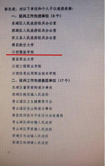 近日,南昌市人民政府、南昌警备区印发了洪府字[2022]10号《关于表彰2021年度征兵工作先进单位和先进个人的通报》的文件通知。我校因征兵工作成绩突出、任务完成较好,受到通报表彰,并荣获“2021年度征兵工作先进单位”荣誉称号。