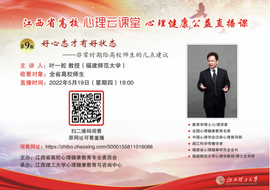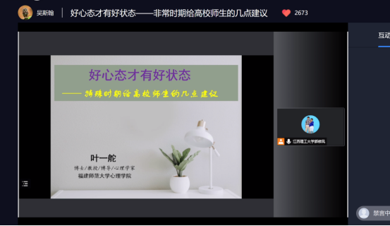通过开展符合学生心理发展特点和心理需求的形式多样的活动,让学生获得心理素质的提升,获得更高的心理素养。心理健康月期间,江西服装学院组织学生参加了“心理云课堂”公益直播课、年度优秀心理委员评选,校园心理情景剧大赛、校园心理微电影大赛等一系列符合学生专业特色和心理特点的活动。5月19日晚,叶一舵教授为同学们带来“好心态才有好状态”的专题报告,为大家介绍了心理位移技术,各年龄段积极心理的培养,如何进行自我激励,做到扬长避短、悦纳自我等内容。