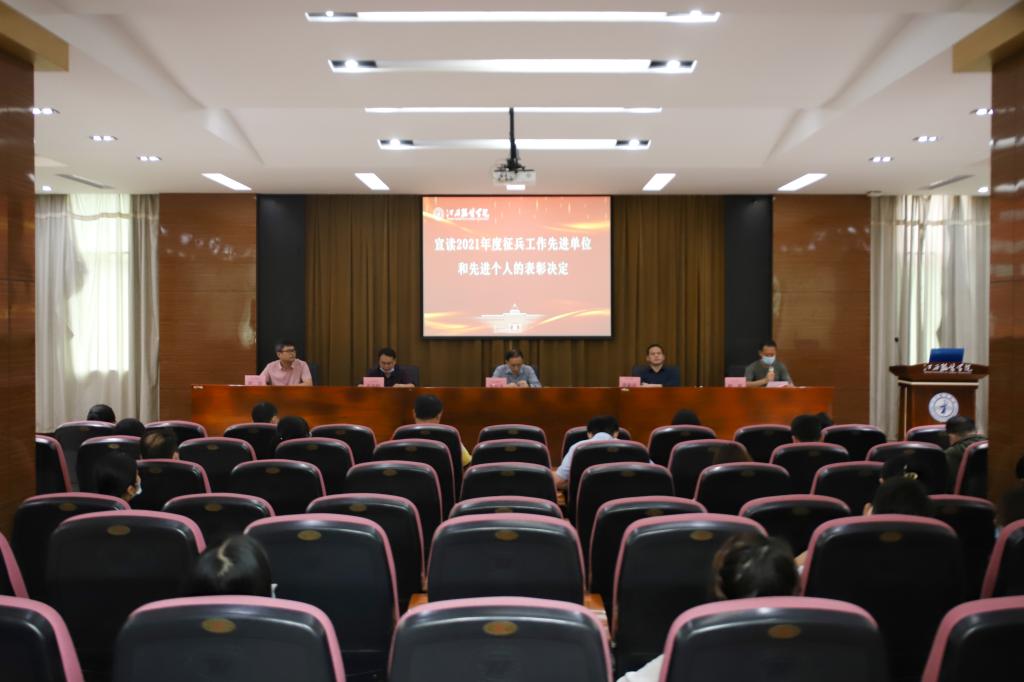 【新闻中心讯 文/李金燕 图/黎静怡】5月27日下午,我校在行政楼一楼报告厅召开2021年征兵工作总结表彰大会暨2022年征兵工作推进会。党委书记陈付龙、党委副书记唐新强出席会议。参加会议的有学工处处长邓良峰、武装部副部长鲍鹏、武装部办公室副主任胡康、各学院党总支书记(副)、2022届毕业班辅导员(班主任)、2023届毕业生辅导员代表。会议由党委副书记唐新强主持。