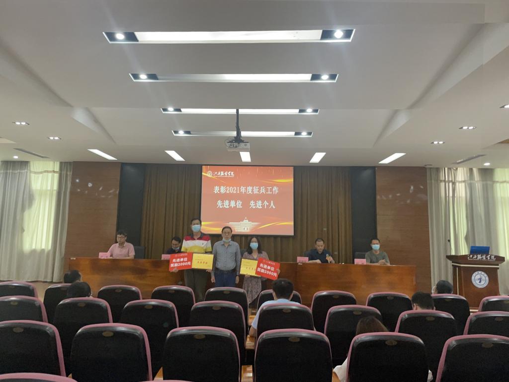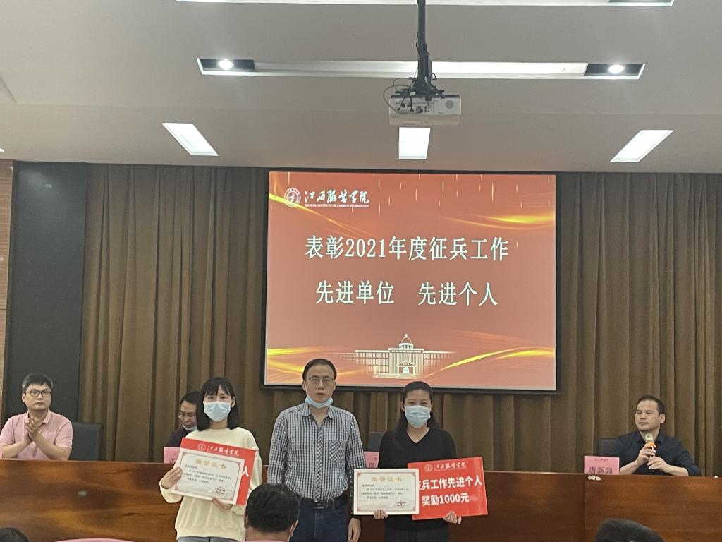 会上,武装部副部长鲍鹏对2021年度征兵工作进行了总结并宣读《关于表彰2021年度征兵工作先进集体和先进个人的决定》。他说,2021年是征兵工作全面实施“一年两征、两退”的开局之年,在校党委高度重视和直接领导下,在各部门通力协作下,应征入伍同学经过了初审、体检、政治考核、役前训练、公示等程序的严格筛选,全年应征入伍达63人,其中毕业生59人,在校生4人,毕业生应征入伍完成率达180%,超额完成了征兵办下达的征兵任务数,并荣获了2021年南昌市征兵工作先进单位。总结中,鲍鹏对征兵工作取得的成绩和下一步任务目标进行了分析,表示要扎实做好征兵入伍各项工作,确保高质量完成2022年征兵工作任务。