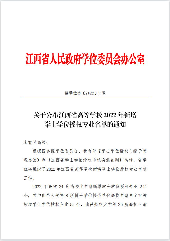 新闻中心讯(撰稿:质评中心)5月31日,江西省人民政府学位委员会办公室发布了《关于公布江西省高等学校2022年新增学士学位授权专业名单的通知》(赣学位办〔2022〕9号),我校“物流管理”“物联网工程”“数据科学与大数据技术”“网络与新媒体”四个专业成功新增为学士学位授权专业。