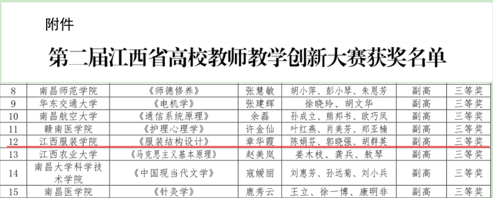 【新闻中心讯 教务处董少武撰稿】根据《关于公布第二届江西省高校教师教学创新大赛获奖名单的通知》(赣教高办函〔2022〕5号),我校章华霞副教授主持的课程《服装结构设计》在第二届江西省高校教师教学创新大赛中荣获副高组三等奖。