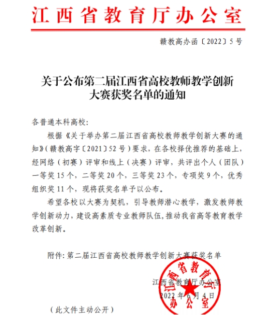 据悉,第二届江西省高校教师教学创新大赛共评选出个人(团队)一等奖15 个,二等奖 20 个,三等奖 23 个,专项奖 9 个,优秀组织奖 11 个。