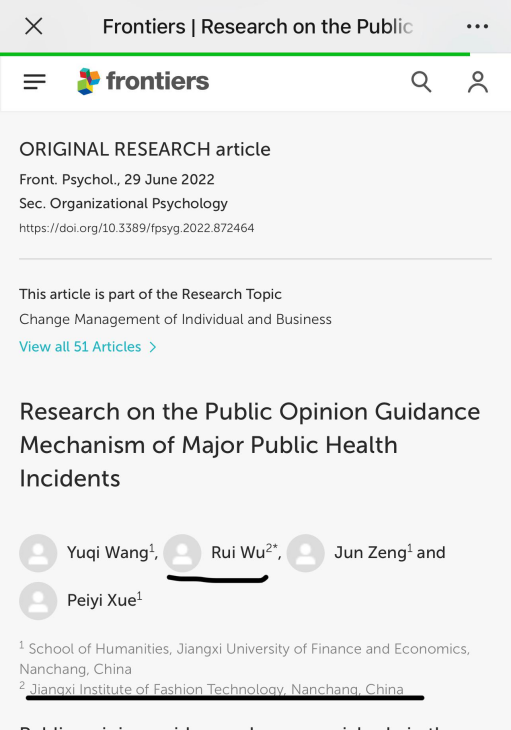 论文发表方面:吴锐(二作) 论文《Research on the Public Opinion Guidance Mechanism of Major Public Health Incidents》,Frontiers in Psychology刊物,2022年6月 sci 1区