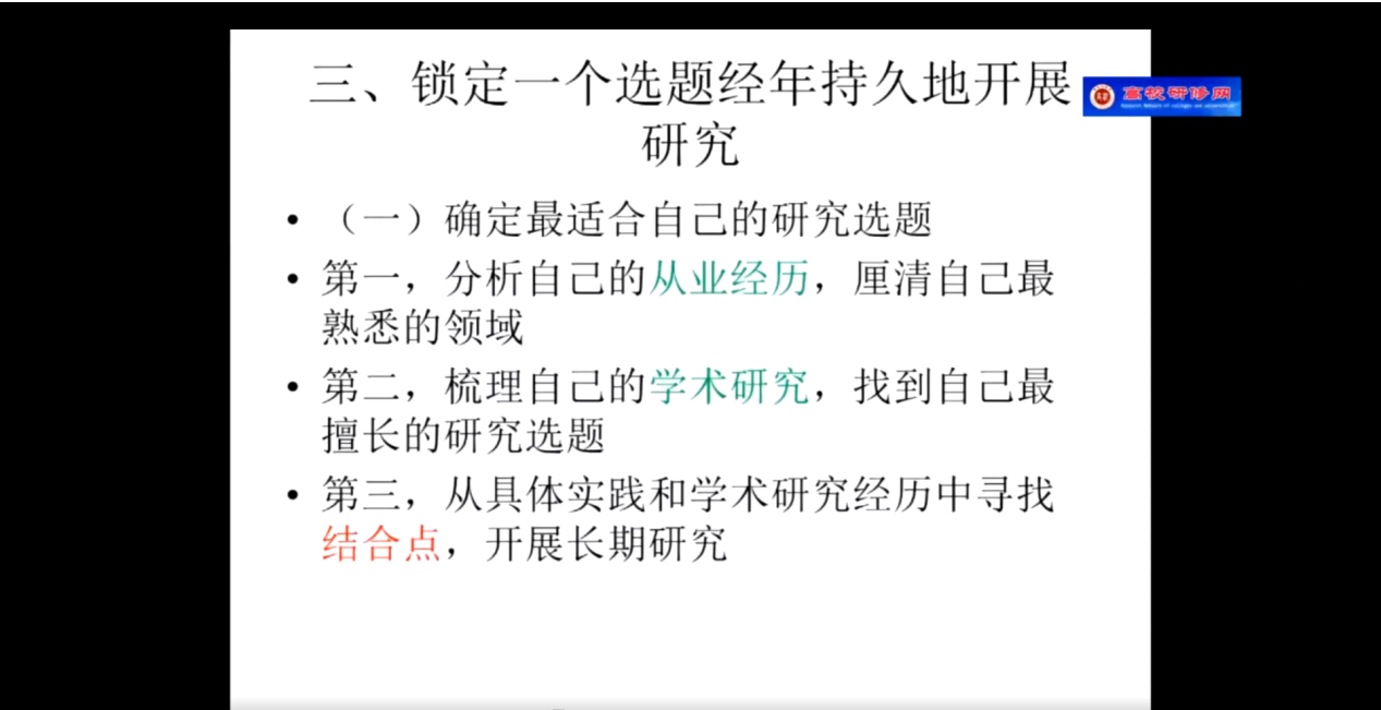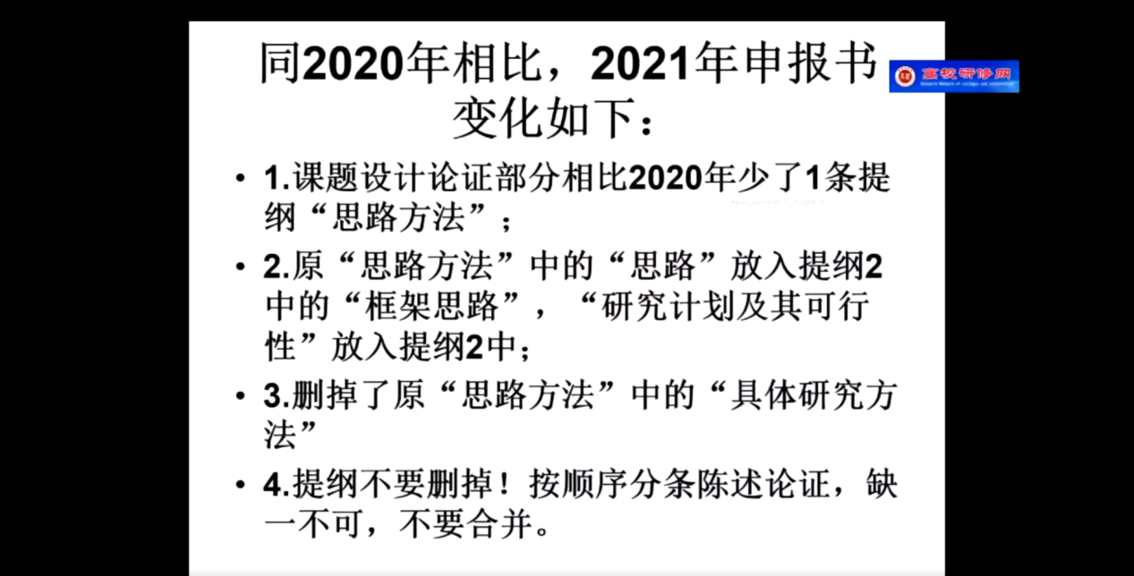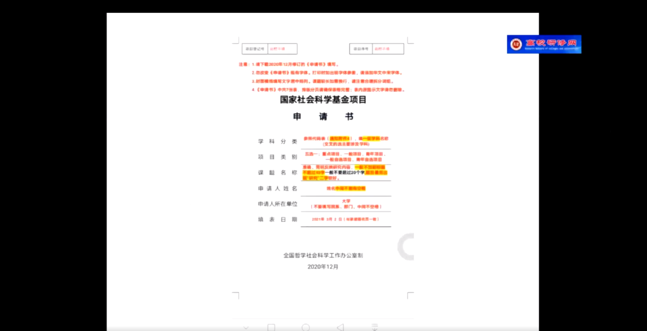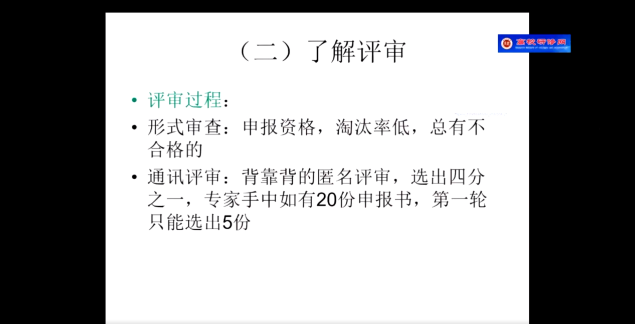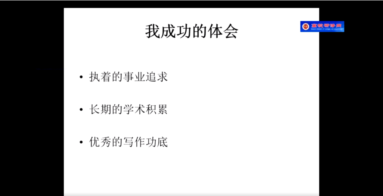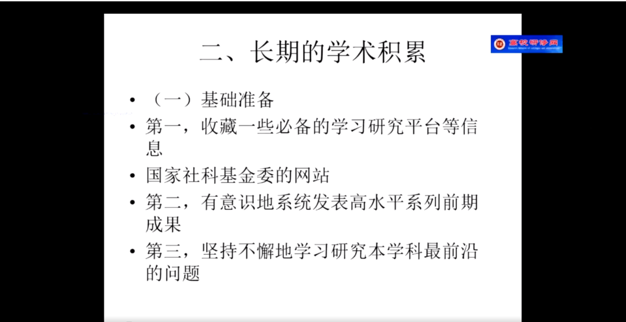 第二项,教授分享自己的科研经验与心得。教授将自己的经验提炼为三点:执着的事业追求,长期的学术积累以及优秀的写作功底,随即就这三点就行展开阐述,告诫各位老师一定要将学术科研水平当做自己的毕生追求,平时需要加强积累,特别是各位老师不太了解评审环节与具体规则都详细剖析,并给出了针对性建议,特别是年青教师一定要尽早找到适合自己研究方向,做好长期研究的准备。最后部分,教授以自己手上的申报书为例详细讲解申报书各项内容撰写要点以及注意事项。