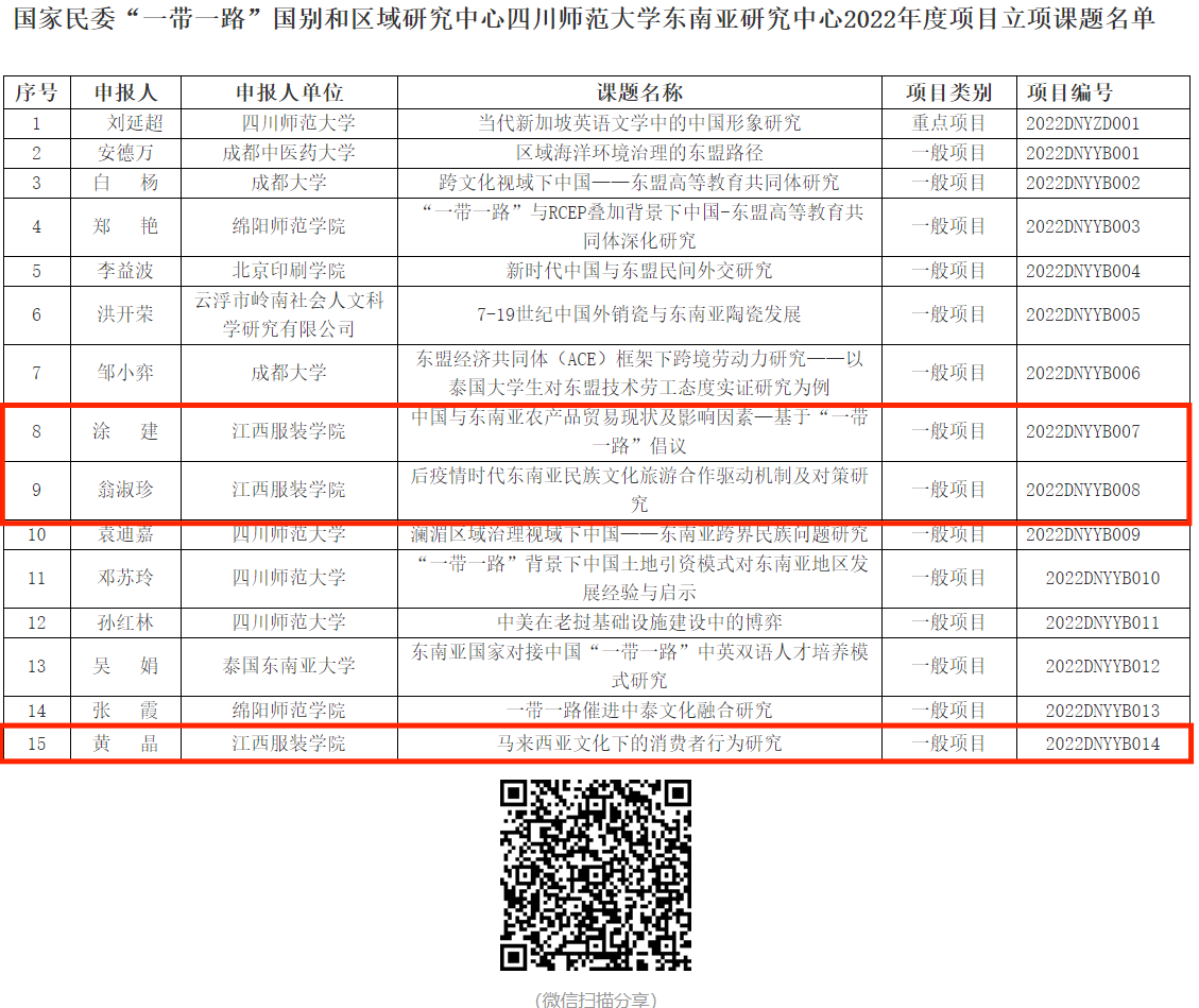 近日,在国家民委“一带一路”国别和区域研究中心公示的2022年度项目立项课题名单中,我校商学院翁淑珍、涂建、黄晶等三位教师所申报的国家民委一般课题获批立项。本次共从全国申报者中评审出15个项目获批立项,其中重点项目1项,一般项目14项,其中我校获批3项一般项目立项。