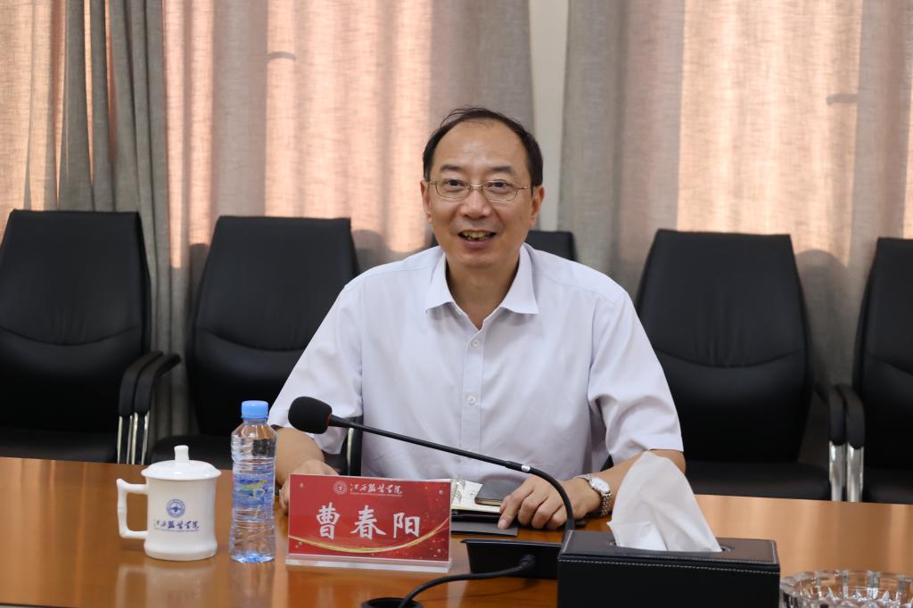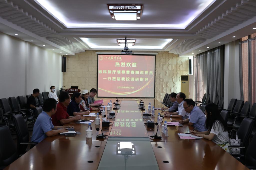 新闻中心讯(图/文 万强) 9月27日下午,江西省科技厅二级巡视员曹春阳一行四人来我校调研指导工作,我校校长薛家宝、副校长陈东生陪同调研,科技产业处、校企合作办公室、服装设计学院等相关负责同志参加此次调研。