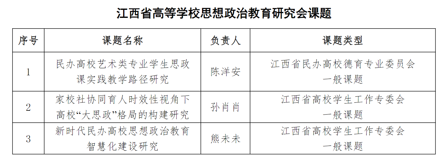 新闻中心讯(科技产业处 王志霞供稿)近日,江西省教育厅公布了2024年江西省高等学校思想政治教育研究会课题评审结果,我校教师陈洋安申报的《民办高校艺术类专业学生思政课实践教学路径研究》获江西省民办高校德育专业委员会一般课题立项,孙肖肖老师申报的《家校社协同育人时效性视角下高校“大思政”格局的构建研究》获得江西省高校学生工作专委会一般课题立项,熊未未老师申报的《新时代民办高校思想政治教育智慧化建设研究》获江西省高校学生工作专委会一般课题立项。
