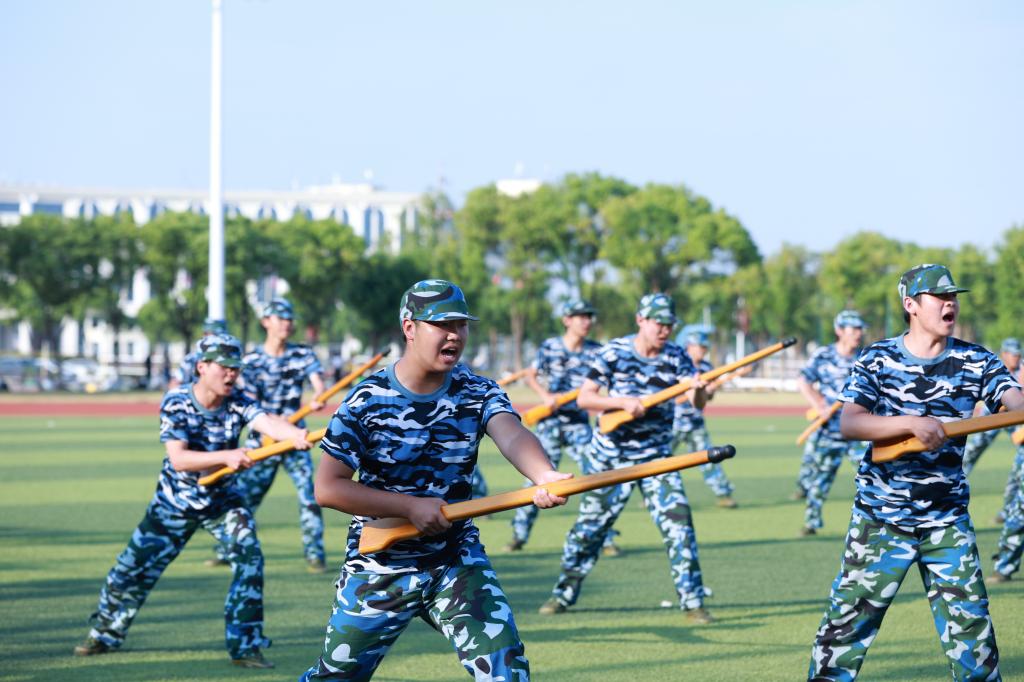 汇演总指挥教官整理好队伍后,面向主席台报告,学校领导指示:“按计划进行!”随着教官一声令下,现场气氛瞬间点燃。2024级参训新生依次进行分列式队列、擒敌拳、刺杀操、匕首操军事项目表演。