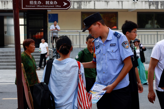 保卫处工作人员在学校大门、霓裳宫广场、西区通道口等地负责安全保卫、交通指引与疏导,为新生和家长“指点迷津”;警民同心、反诈同行,驻地民警深入校园开展反诈宣教,为同学们的校园生活保驾护航。