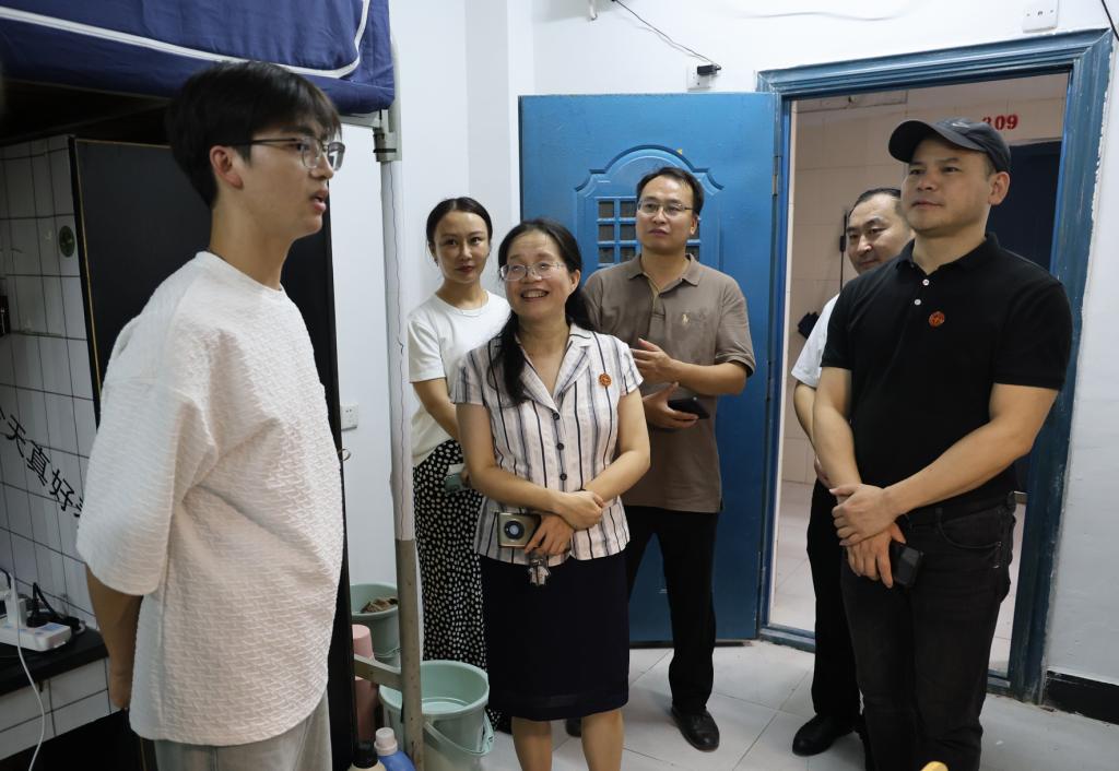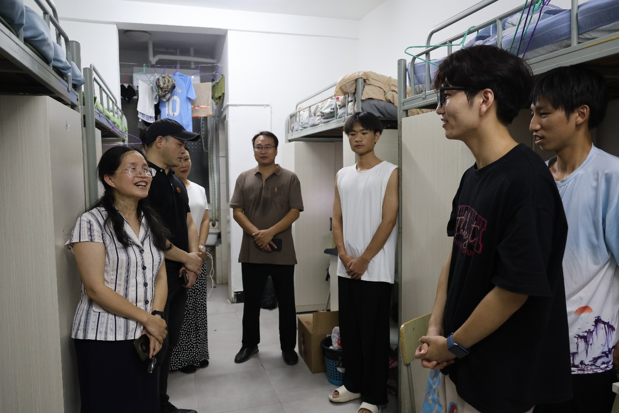 晚餐后,林井萍来到清河区学生宿舍,在寝室内与同学们聊家常、话生活。她认真查看了学生宿舍的基础设施,详细了解学生的学习、生活和住宿等情况,“暑假过得怎么样”“晚上一般干什么”“对将来就业有什么计划”……亲切关怀的问候温暖了同学们的心,也打开了同学们的“话匣子”,大家畅谈校园生活、学业规划和人生发展等话题。在得知同学们的就业意向后,林井萍希望同学们珍惜大学生活,扎实学好专业知识和技能,坚定信心,砥砺奋进,收获成功。