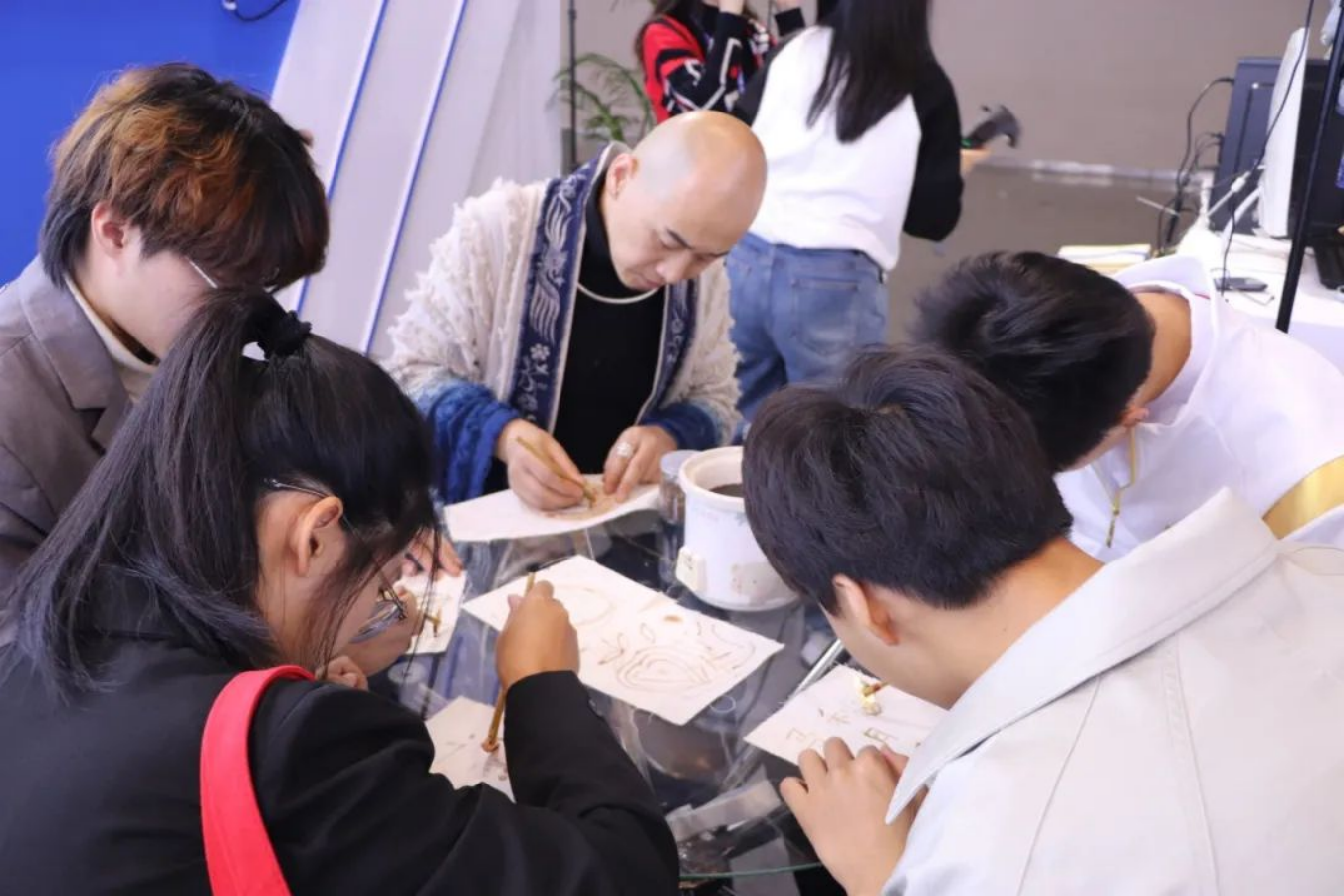 同时在蜡染体验区现场,国家级非物质文化遗产苗族蜡染技艺传承人成昊大师、戴之华老师亲自教学,参展观众可以选择自己喜欢的蜡染图案,在两位老师的引导下,制作出独属于自己的蜡染作品。