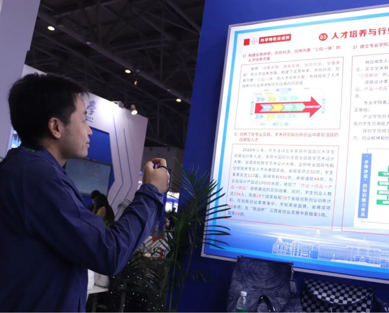 本次高博会,江西服装学院展厅集合学校简介、人才培养模式、办学特色与成效等主题板块,设置产品展示专区、多媒体展示专区、蜡染体验专区及服饰VR动态展示专区等多个特色区域,多角度彰显江服育人成效。