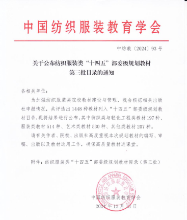学校首次大规模获批中国纺织服装教育学会的纺织服装类“十四五”部委级规划教材54部,申报获批率100%;2023年本科毕业设计(论文)在教育部抽检中合格率100%,其中有4篇论文在全省前100名之列。