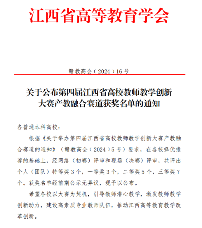 学校荣获首批江西省校企合作一流本科课程1门、首批江西省“十四五”普通高等教育本科省级规划教材入选以及立项建设3部、江西省高校教师教学创新大赛首批产教融合赛道三等奖1项。