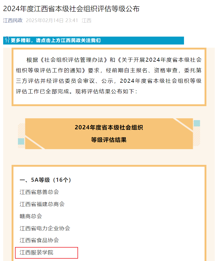 新闻中心讯(万强) 近日,江西省民政厅公布了2024年度省本级社会组织等级评估结果,我校荣获“5A级社会组织”。