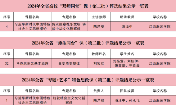 在思政课程建设方面,由我校马克思主义学院陈洋安老师主讲、人文学院潘泽中老师助讲的《习近平新时代中国特色社会主义思想概论》课程“传承服章礼乐文明 铸就中华文化新辉煌”专题课入选“双师同堂”课;由我校马克思主义学院刘紫君老师主讲,刘品萱、刘桂伊、傅鑫豪、宁良晨等同学参与的《马克思主义基本原理》课程“量变质变规律”专题课入选“师生同台”课;由陈洋安、潘泽中、孙承飞老师负责的《习近平新时代中国特色社会主义思想概论》课程“铸就社会主义文化新辉煌”专题课入选“专题+艺术”特色思政课。