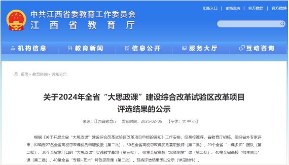新闻中心讯(文/陈洋安)近日,江西省教育厅公布了2024年全省“大思政课”建设综合改革试验区改革项目评选结果,经高校推荐、省教育厅初核、组织省外专家评审等多个环节,我校凭借扎实的思政教育工作基础与创新实践,揽获多个奖项。
