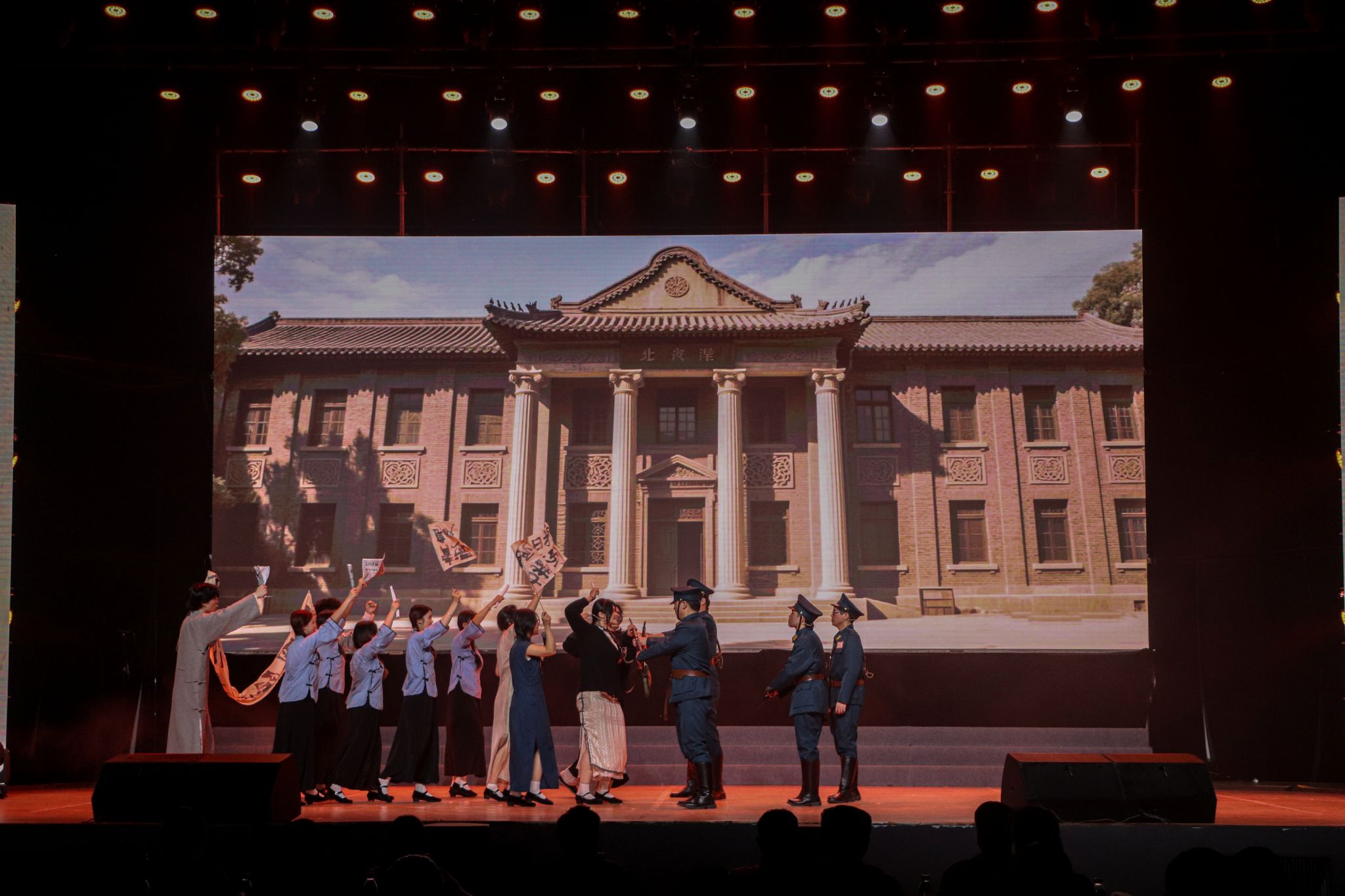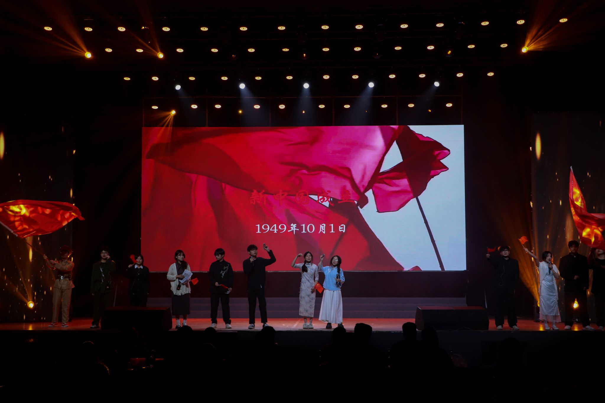 进入第二阶段后,各学院纷纷亮出精心编排的自选节目,涵盖话剧、舞蹈、舞台剧等多种形式。艺术设计学院带来的话剧《破晓》,通过多维艺术表现手法,展现中国智造的飞速发展;人文学院的舞蹈《红船》以肢体语言描绘历史长河中的信仰传承;商学院的《灯火里的中国》以柔美舞姿勾勒出万家灯火下的盛世图景;服装设计学院的话剧《星火长明》融合非遗技艺与现代科技,诠释传统与创新的碰撞;服装工程学院的《小河淌水1952》以舞蹈再现峥嵘岁月;时尚传媒学院的《烟雨落霓裳》尽显古典之美;大数据学院的《美丽中国》则以欢快节奏舞动新时代中国的蓬勃生机。