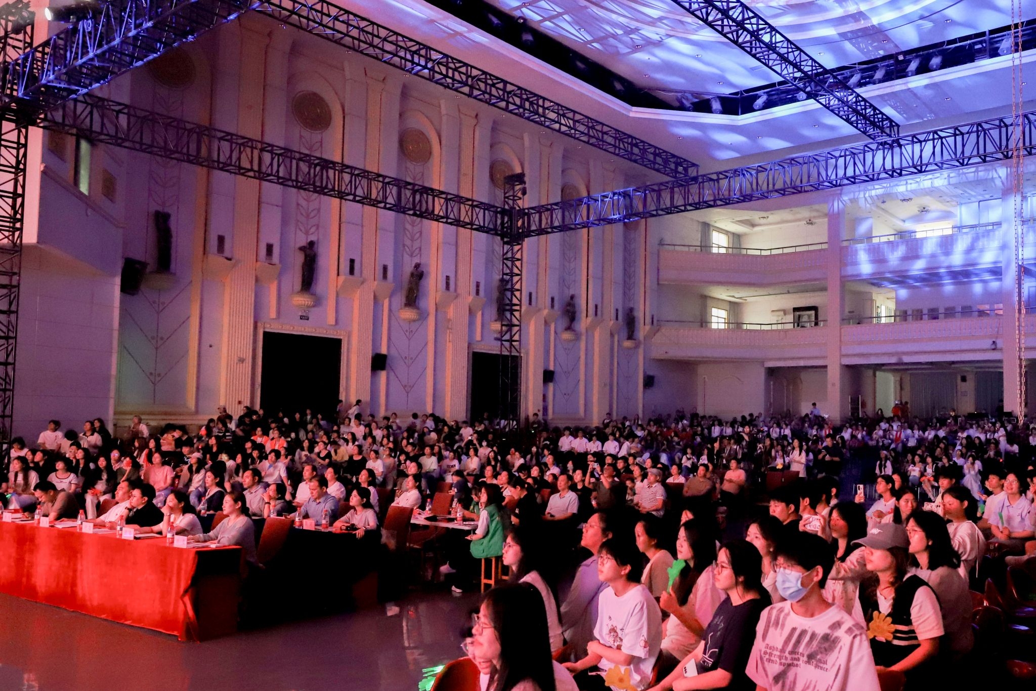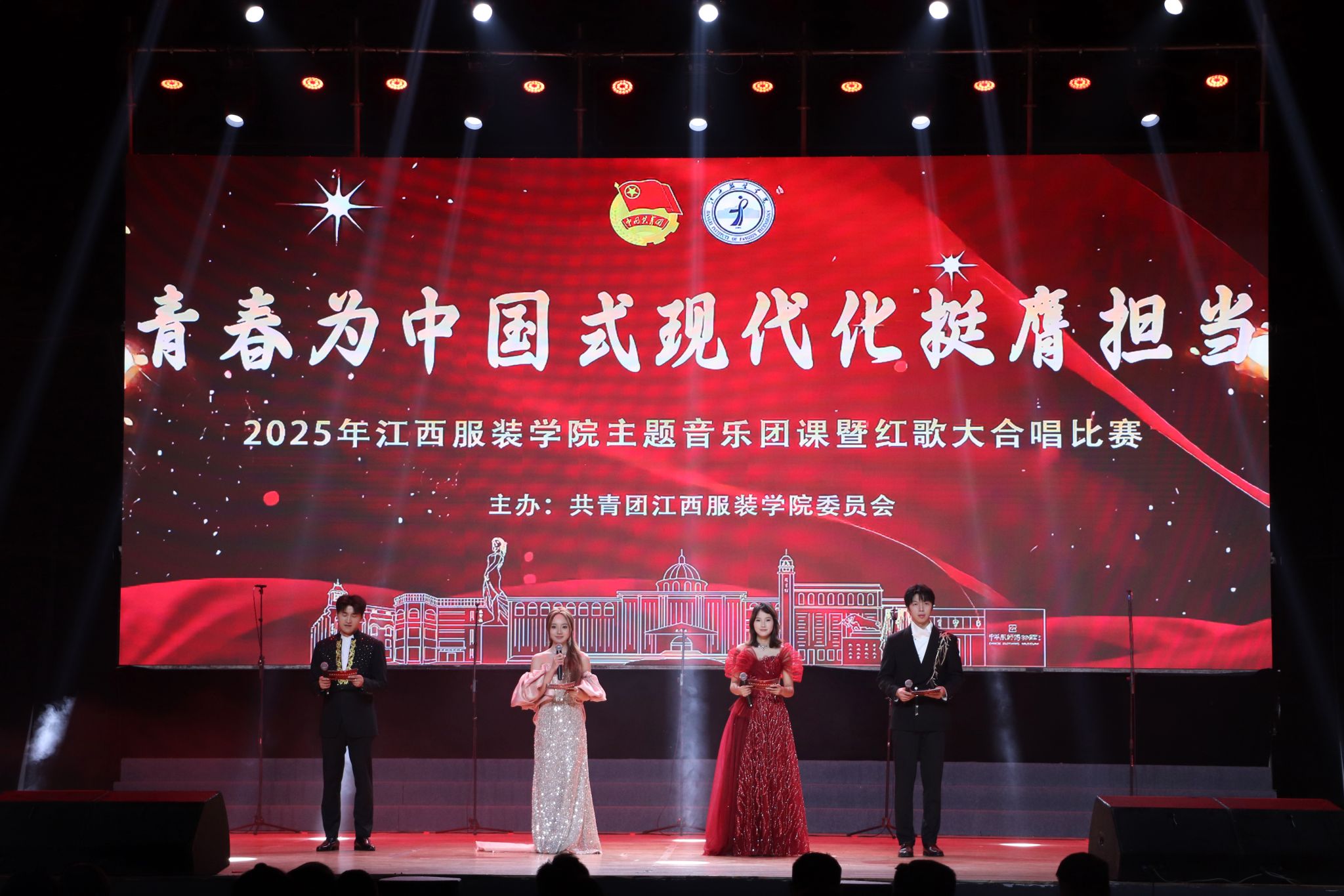 新闻中心讯(文/樊翔 图/钟宏鹏 黄梓翔)为深入贯彻党的二十大精神,致敬“红五月”的革命传统与奋斗精神,弘扬红色文化,赓续红色基因,以青春之力营造积极向上的校园文化氛围。5月27日晚,“青春为中国式现代化挺膺担当”主题音乐团课暨红歌大合唱比赛在我校霓裳宫举行。校党委书记林井萍、党委副书记唐新强、校长助理马国照以及江西应用科技学院团委书记张荆莅临本次活动,党委组织部、宣传部、学生工作部、校团委以及各学院党委负责人和1800余名师生共同在现场观看了本次主题团课暨红歌大合唱比赛。