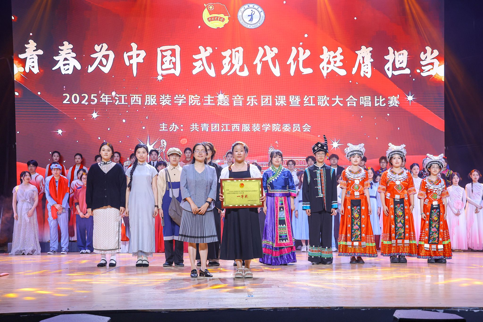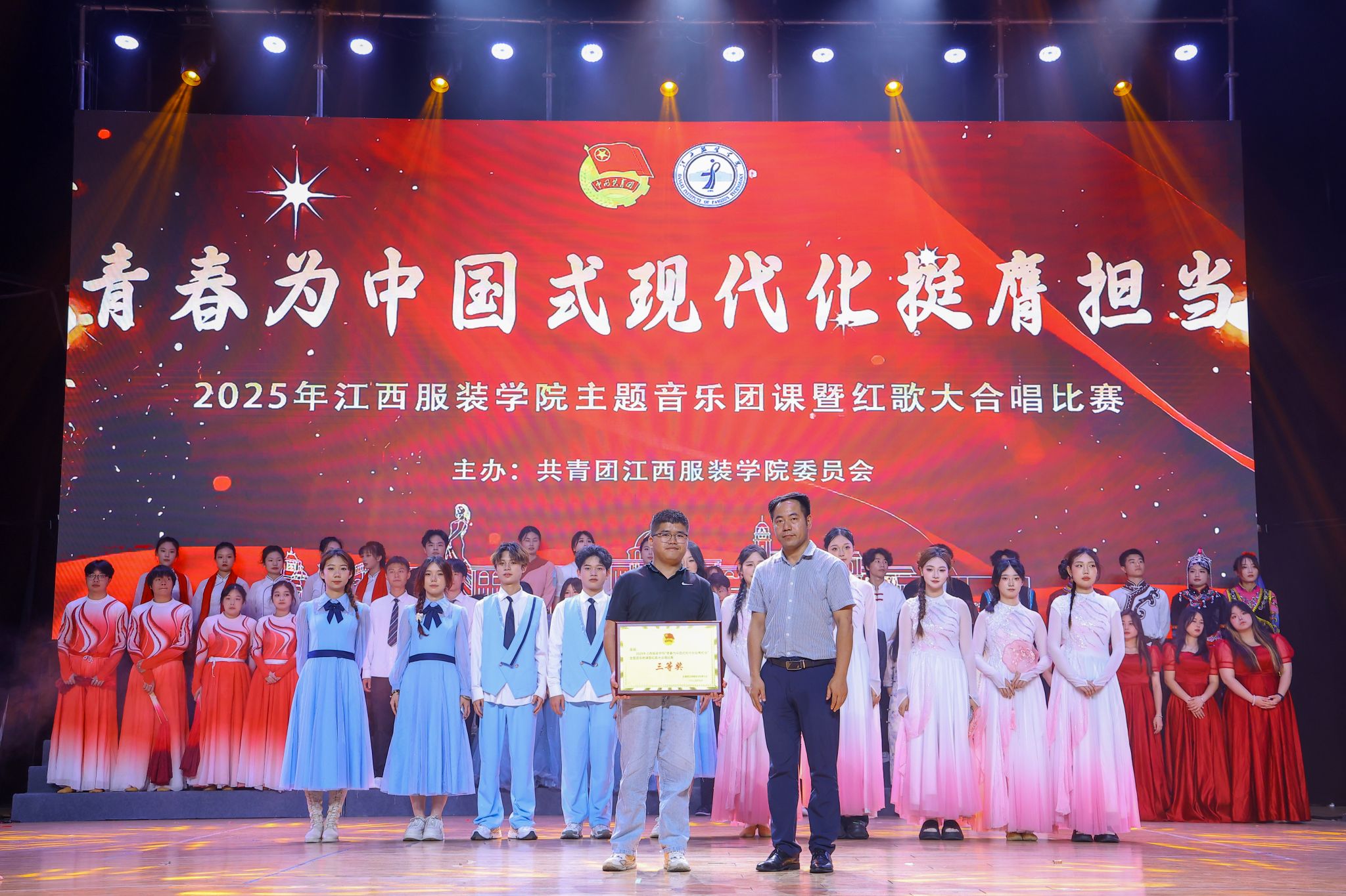 经过激烈角逐,最终服装设计学院荣获一等奖,服装工程学院荣获二等奖,时尚传媒学院荣获三等奖。大数据学院、人文学院、商学院、艺术设计学院等荣获优秀奖,服装设计学院刘品萱、服装工程学院郑晓晓荣获优秀指挥奖。颁奖环节气氛热烈,嘉宾们依次为获奖集体和个人颁发荣誉证书,并合影留念。