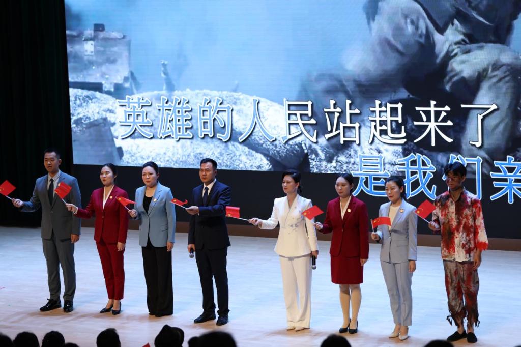 宣讲尾声,宣讲团成员与全场师生共同挥舞鲜艳的五星红旗,齐声高唱《歌唱祖国》。激昂的旋律与铿锵的誓言交织,体育馆内涌动着炽热的爱国情怀。红旗漫卷,歌声回荡,这一刻,长征精神与时代使命同频共振,凝聚成奋进新征程的磅礴力量。