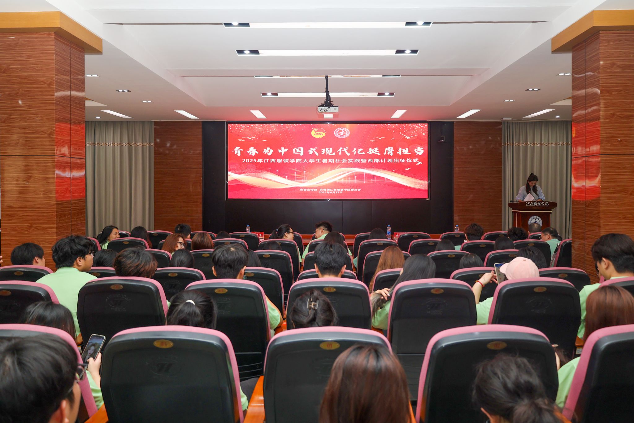 新闻中心讯(供稿/校团委)为深入学习贯彻习近平新时代中国特色社会主义思想,全面贯彻落实党的二十大和二十届二中、三中全会精神,引领广大青年学生在社会实践中挺膺担当,以青春之力助推中国式现代化建设。6月23日上午,我校在行政楼报告厅举行2025年江西服装学院大学生暑期社会实践暨西部计划出征仪式。校党委副书记唐新强出席仪式,党委宣传部、学工处、校团委等部门负责人,校团委专职团干部、各实践队伍带队老师及全体实践团队成员参加了本次活动。活动由校团委书记孟安然主持。