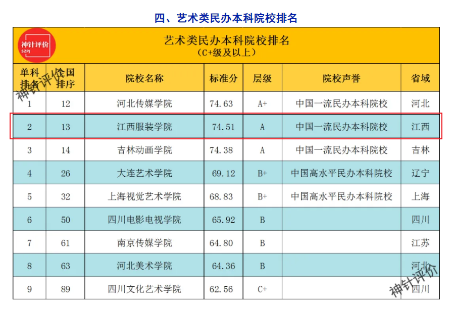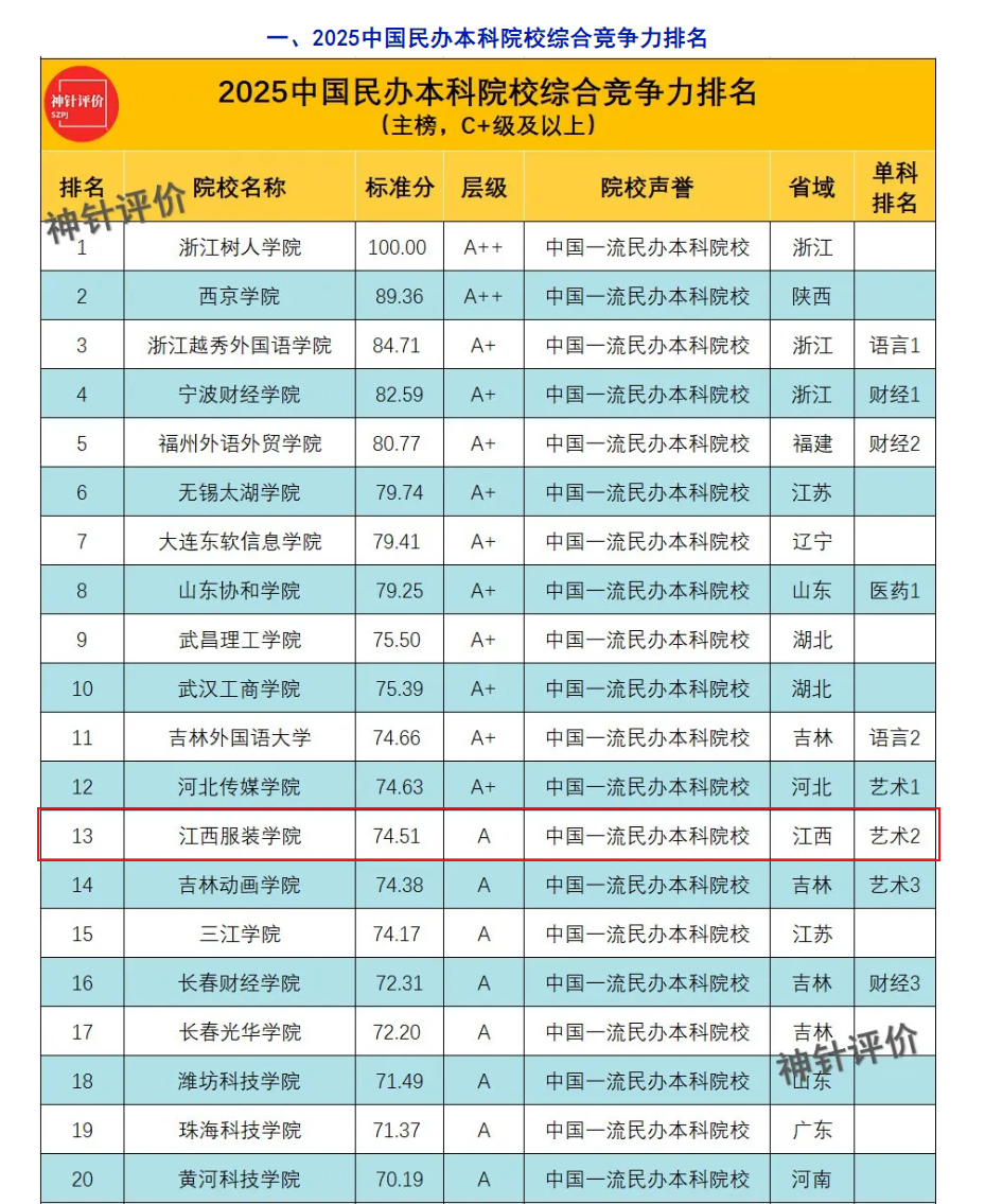 新闻中心讯 近日,神针评价(SZPJ)发布中国民办本科院校综合竞争力排名,评价结果显示,江西服装学院在2025中国民办本科院校综合竞争力排名中位居全国第十三位、江西省第一位,获评为中国一流民办本科院校。在艺术类民办本科院校排名中位列全国第二位。