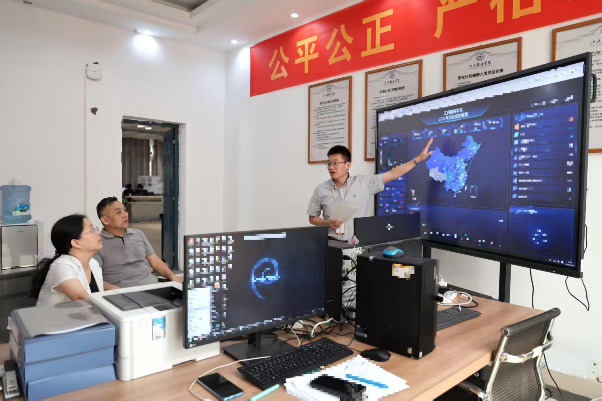 在招生录取现场,林井萍与工作人员深入交流,了解现场设备运行等保障情况,认真听取招生处负责同志关于2025年招生录取实施方案、录取流程、信息公开等工作的汇报,重点询问了各省录取进度、各专业录取详情、通知书发放以及新生数据安全保密等情况。