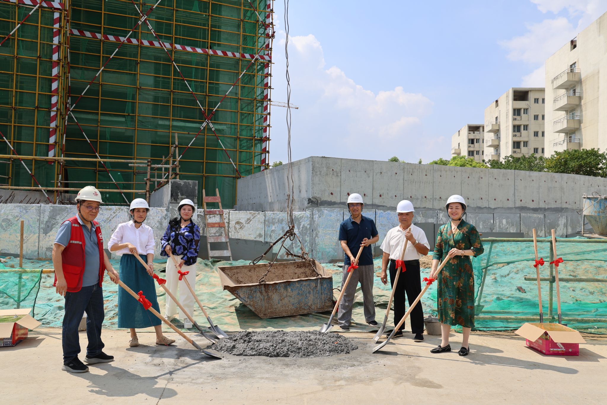 伴随着礼炮声,涂智勇、涂燕萍和各位领导、嘉宾共同挥锹铲运最后一方混凝土,为大学生服务大楼建设项目主体封顶仪式画上了圆满的句号。