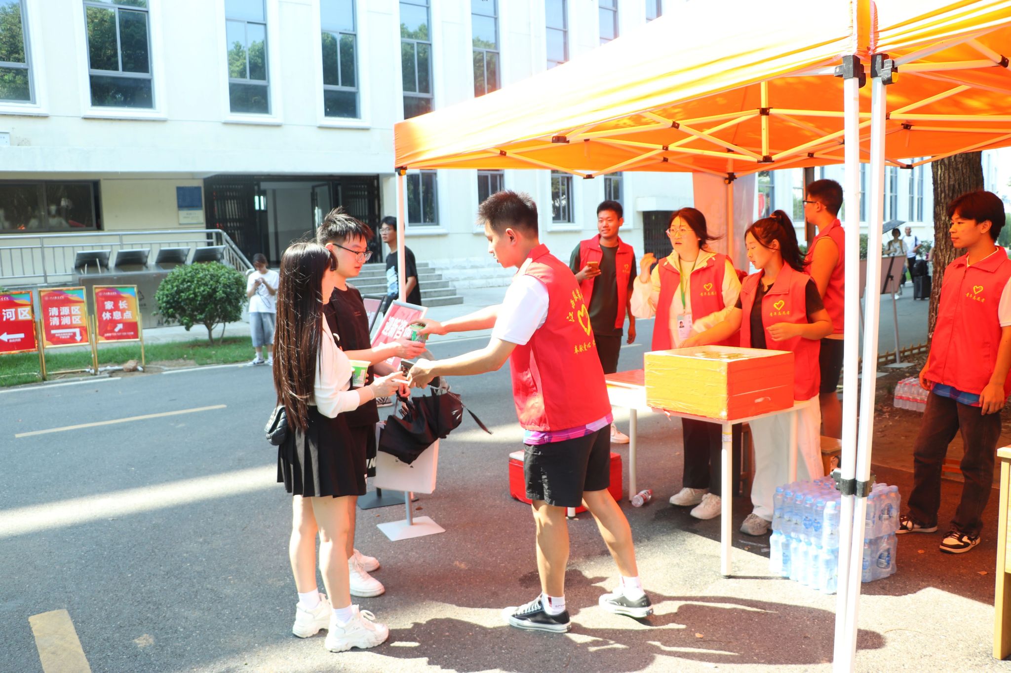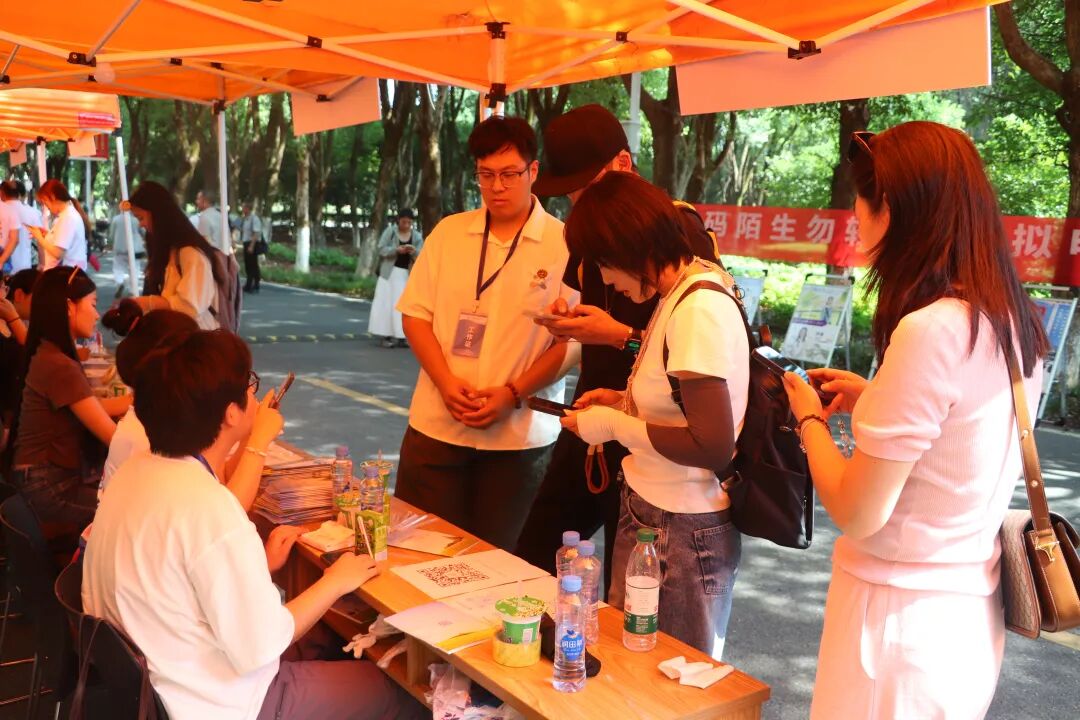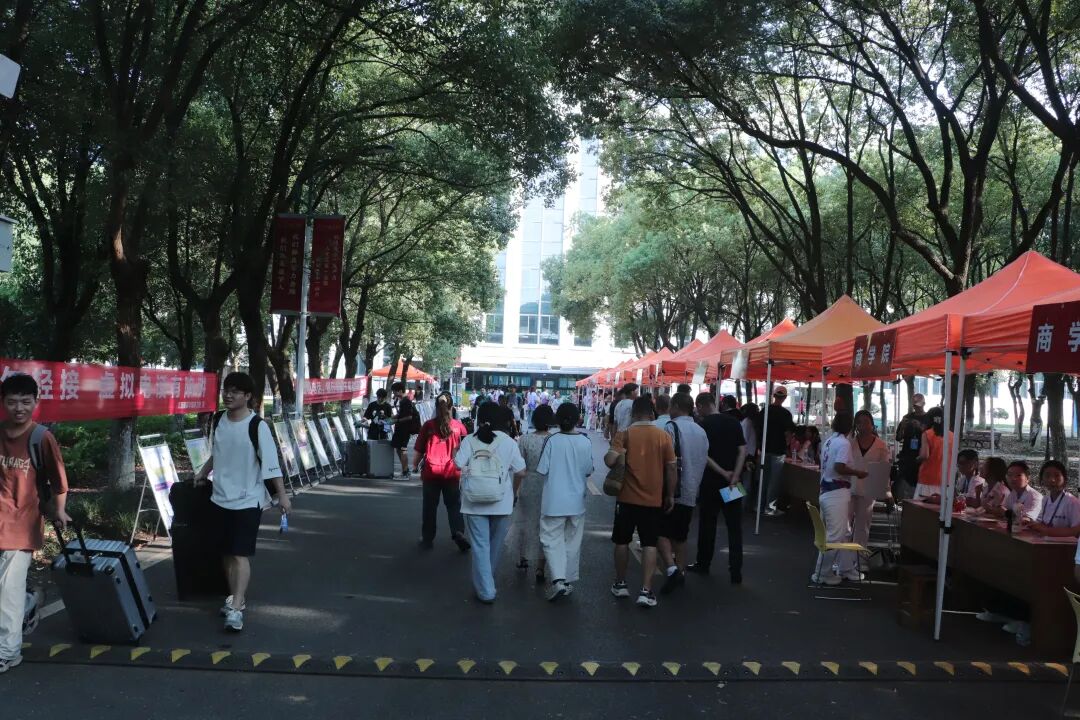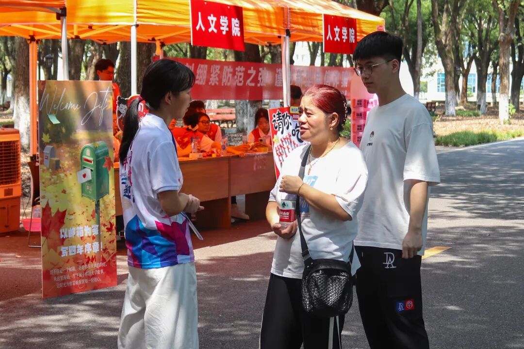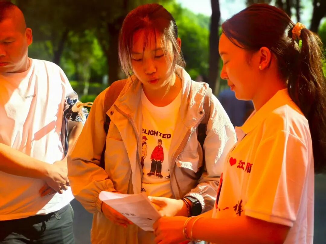 在炎热的天气里,一抹抹身着志愿服的身影格外鲜活。他们顶着骄阳穿梭奔走,额间汗珠滚落,衣衫渐渐被汗水浸透,却始终笑意盈盈:主动帮新生提拎行李、为家长指引报到路线,用最热忱的双手、最温暖的笑容,把来自江服的关怀,变成新生踏入校园的第一份感动。