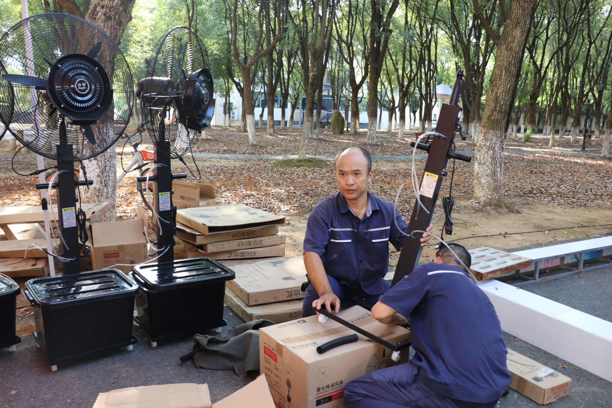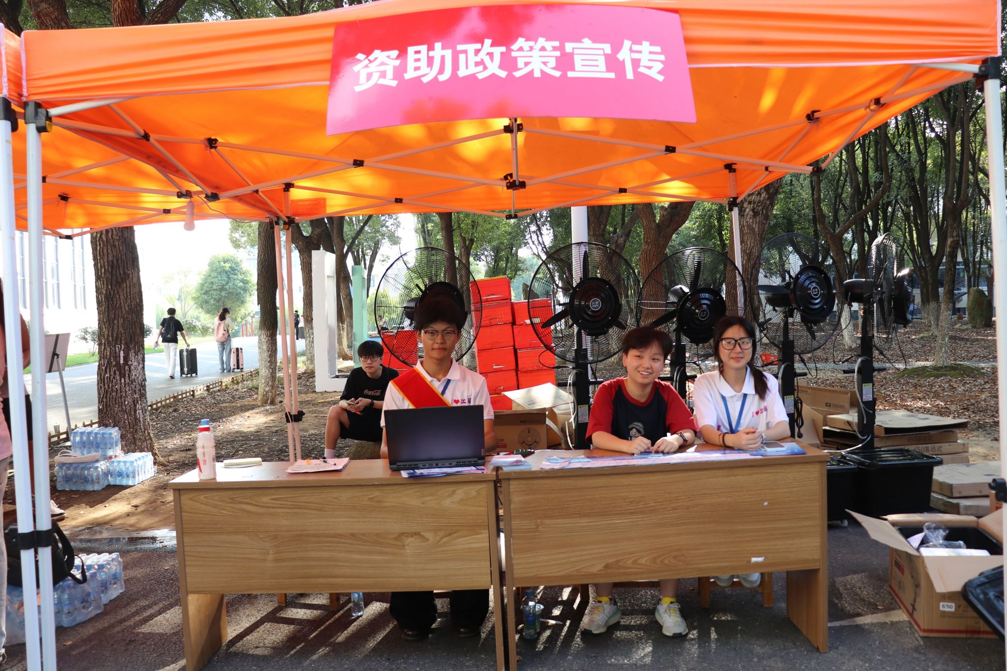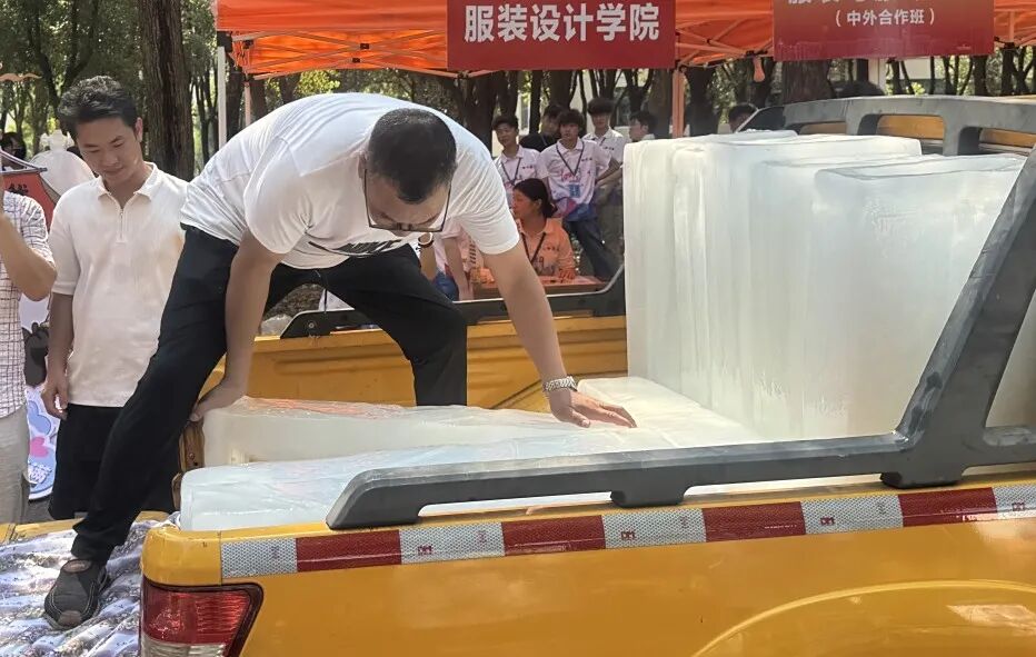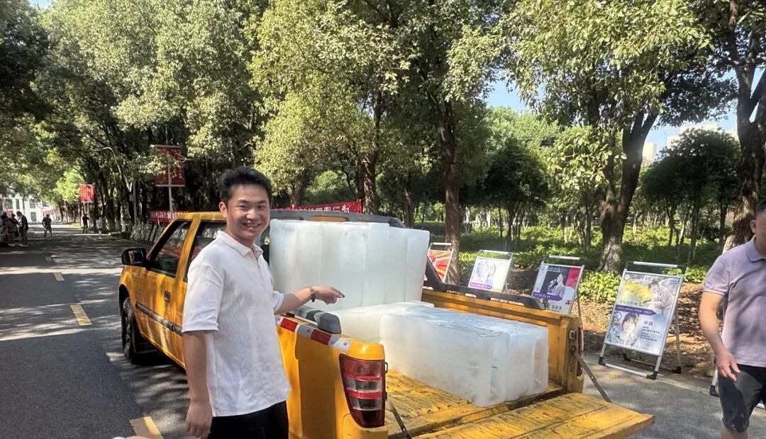 为给25级新生、家长及忙碌的志愿者营造舒适环境,后勤处提前统筹,在各报到点位安排专人值守并架设水风扇,让阵阵凉风为现场送来清爽。更令人暖心的是,服装设计学院 2013 级校友朱志杰心系母校迎新工作,主动无偿为各个迎新点位运送降温冰块,以校友的热忱为这场秋日迎新再添一份清凉与感动。