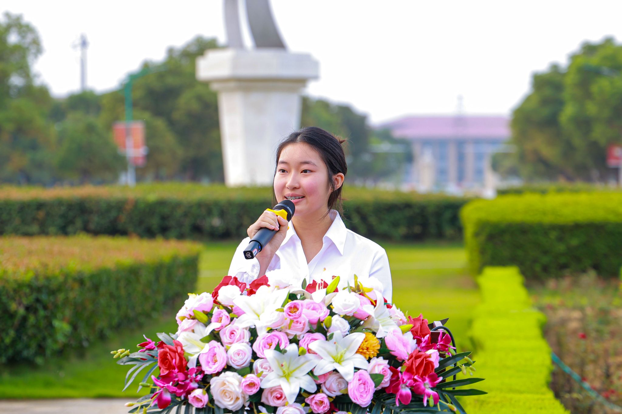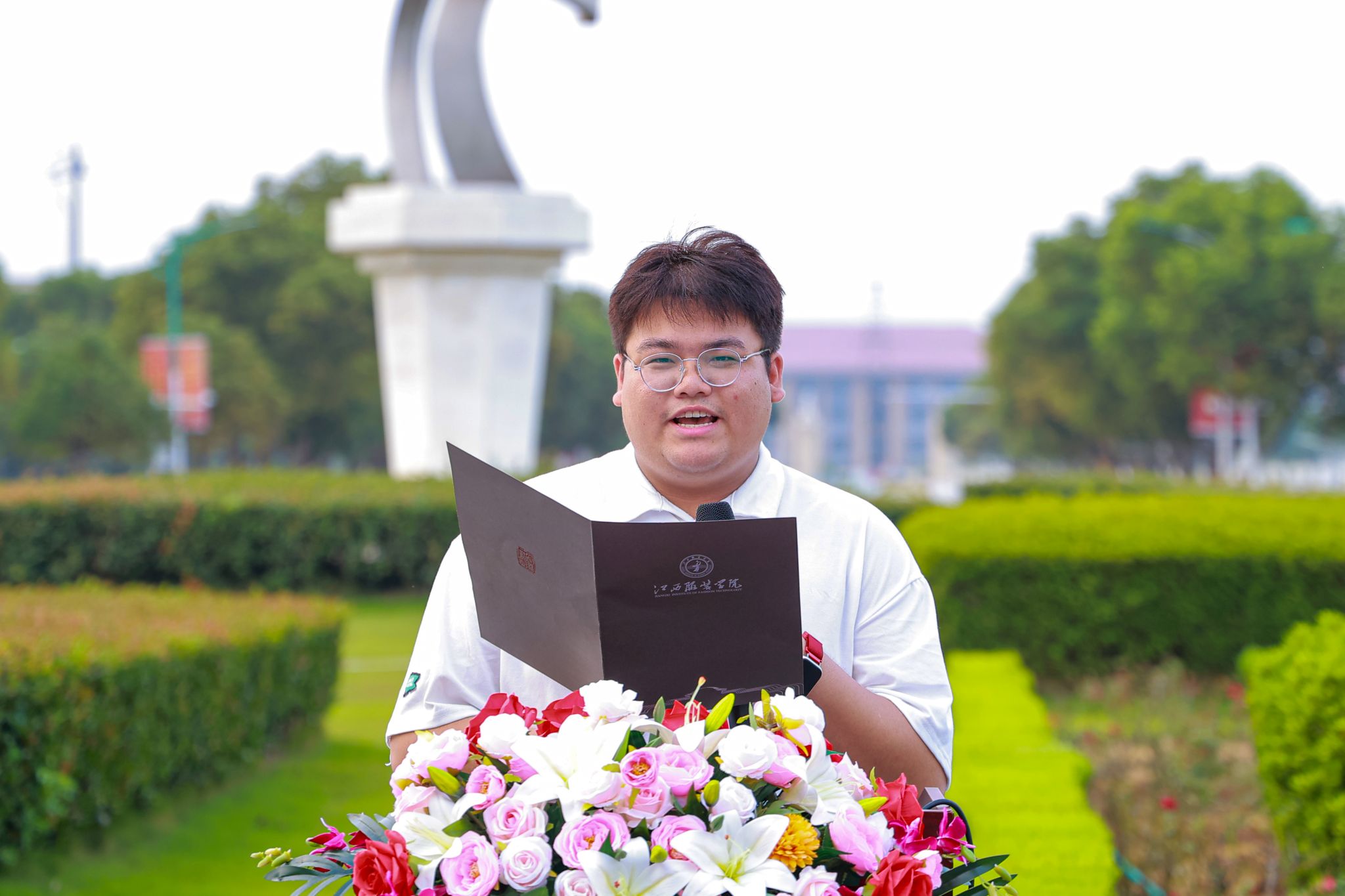 大学生艺术团语言表演队带来朗诵《青春向祖国报告》。学子们以激昂的语调、饱满的情感,诉说新时代青年与祖国同呼吸、共命运的赤子之心,将对祖国的深情告白融入字里行间,为现场师生传递青春奋进力量。