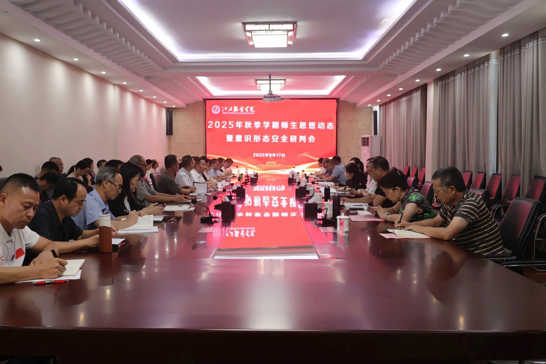 新闻中心讯(文/龙瑞行 图/樊翔)为深入贯彻习近平总书记关于意识形态工作的重要论述,全面掌握师生思想动态,筑牢校园安全稳定防线,9月17日上午,我校召开2025年秋季学期师生思想动态暨意识形态安全研判会。理事长涂燕萍、党委书记林井萍、校长薛家宝及在家校领导出席会议,各学院(部)党政负责人、各部门主要负责人参加会议,党委副书记唐新强主持会议。