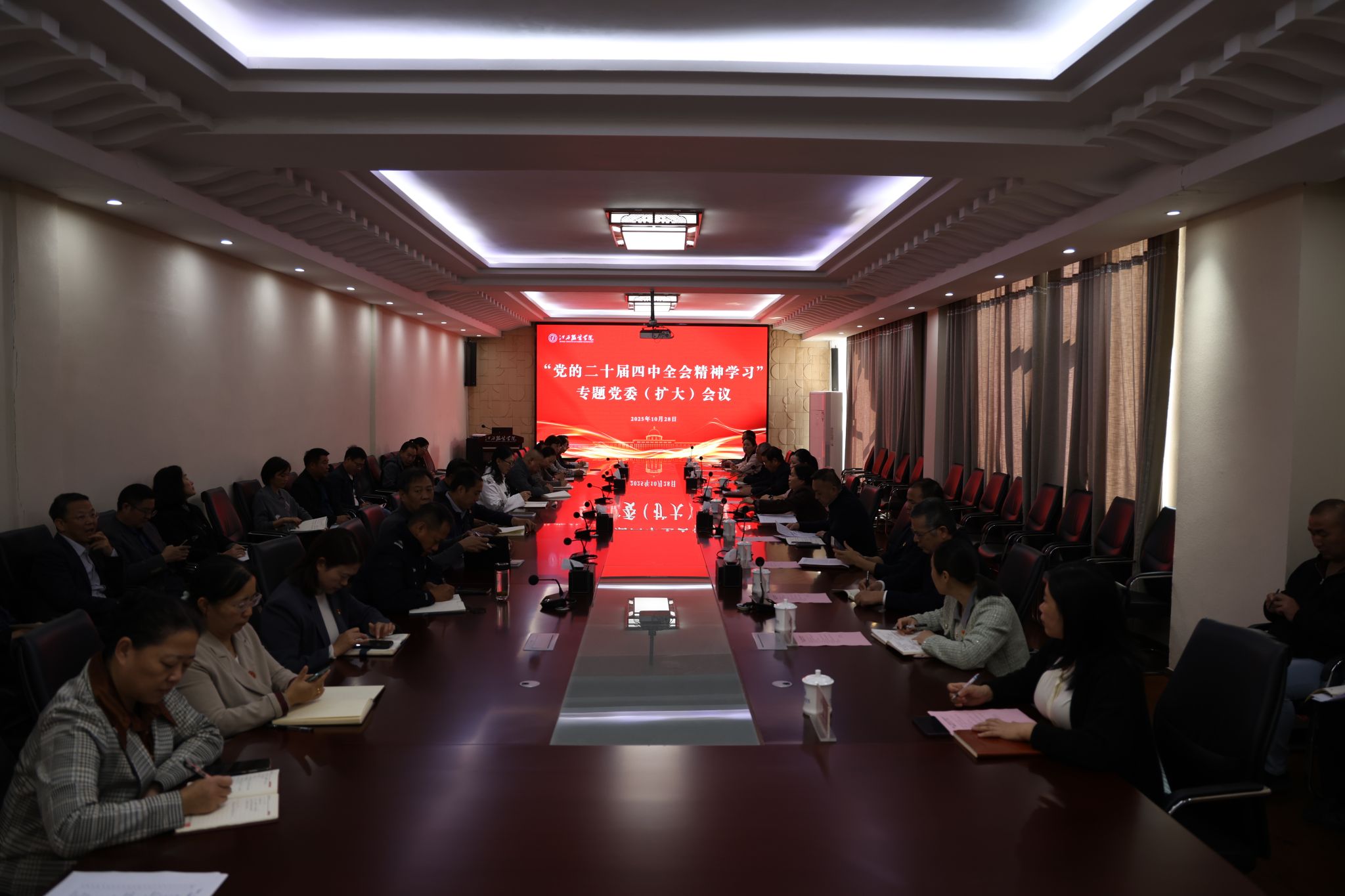 新闻中心讯(文/龙瑞行 图/万强)10月28日,我校召开专题党委(扩大)会议,传达学习党的二十届四中全会精神、省委常委会精神、全省领导干部会议精神和省委教育工委、省教育厅领导干部会议精神,研究贯彻落实意见。校党委书记、督导专员林井萍主持会议并讲话,理事长涂燕萍、校长薛家宝等出席会议。