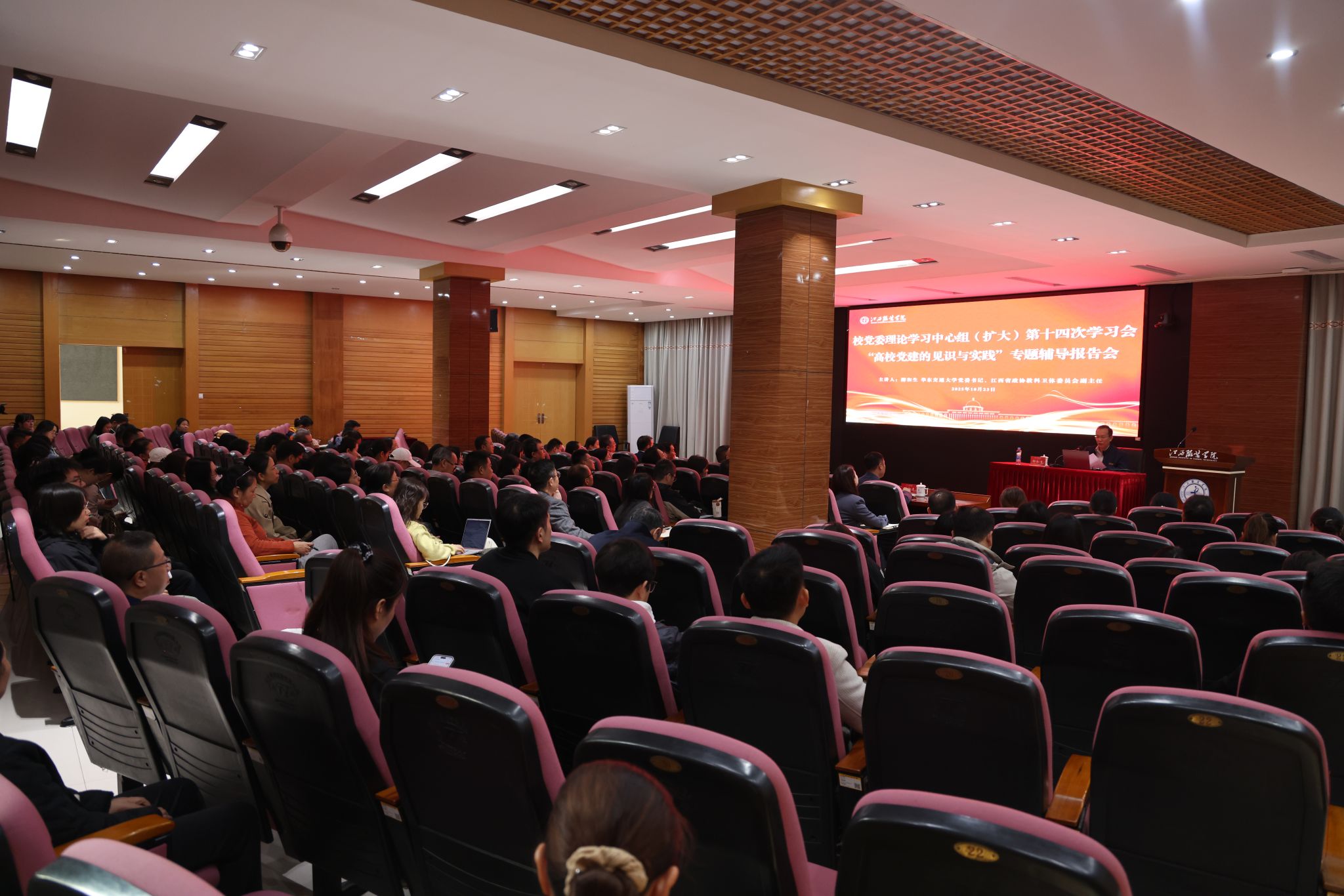 新闻中心讯(文/龙瑞行 图/万强)10月23日上午,我校在行政楼一楼报告厅召开党委理论学习中心组(扩大)第十四次学习会。会议特邀华东交通大学党委书记、江西省政协教科卫体委员会副主任柳和生作专题辅导报告。学习会由校党委书记林井萍主持。全体在家校领导、中层干部,专兼职党务工作者及辅导员参加了此次学习。