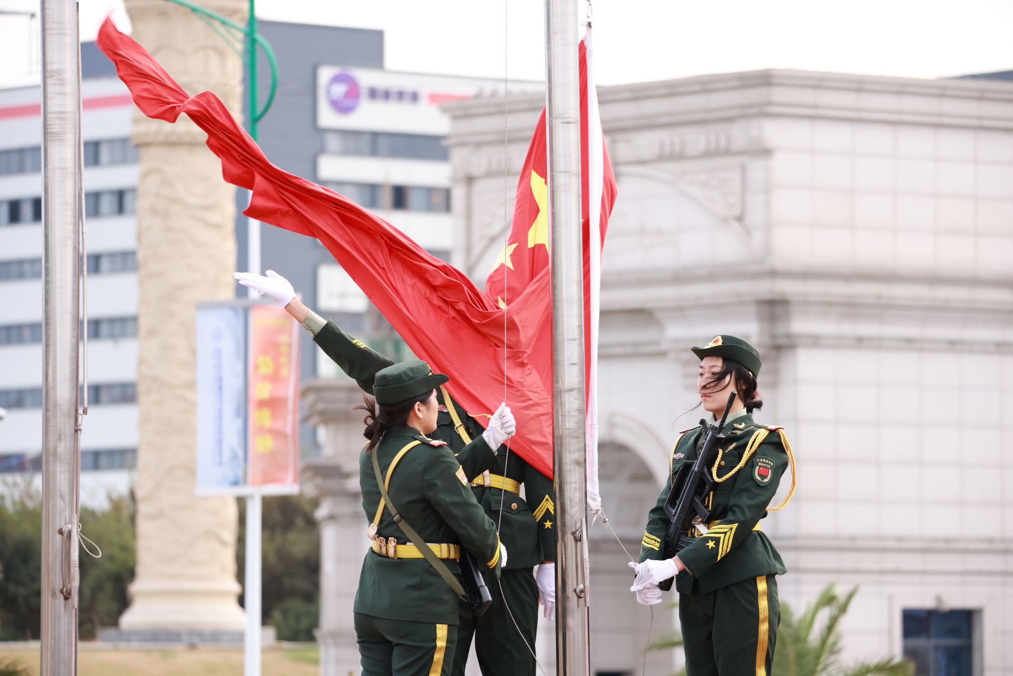 伴着庄严的国歌声响起,国旗队队员迈着整齐有力的步伐,护卫着五星红旗冉冉升起。全体人员向国旗行注目礼,齐声高唱国歌。