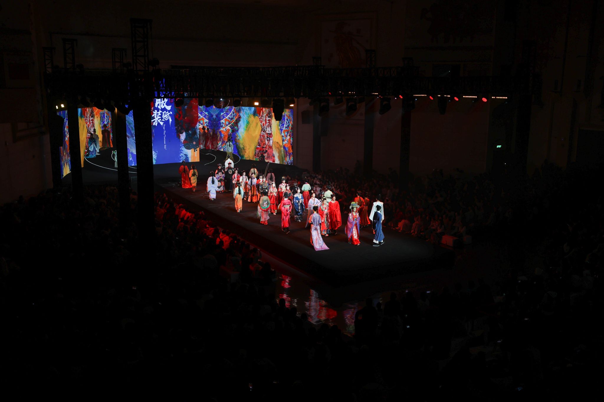 《服装赋》自2021年立项以来,已在校内外完成六场公演,收获了社会各界的广泛赞誉。2025年,《服装赋》在主创团队与300余名师生共同努力下再度全面升级,不仅在舞美设计与服装造型上精益求精,更在节目编排上推陈出新,以民乐《明灯引》与全新演绎的《霓裳羽衣舞》替换原有节目《大唐游春图》,为经典篇章注入全新活力。本次演出通过《秦风汉赋》《唐锦宋韵》《明礼清贵》《丝路畅想》四大篇章,串联起春秋战国至明清的服饰演变史,逾两百套华美服饰与精美配饰在音乐、舞蹈与走秀中交织出一幅流动的华夏文明画卷。