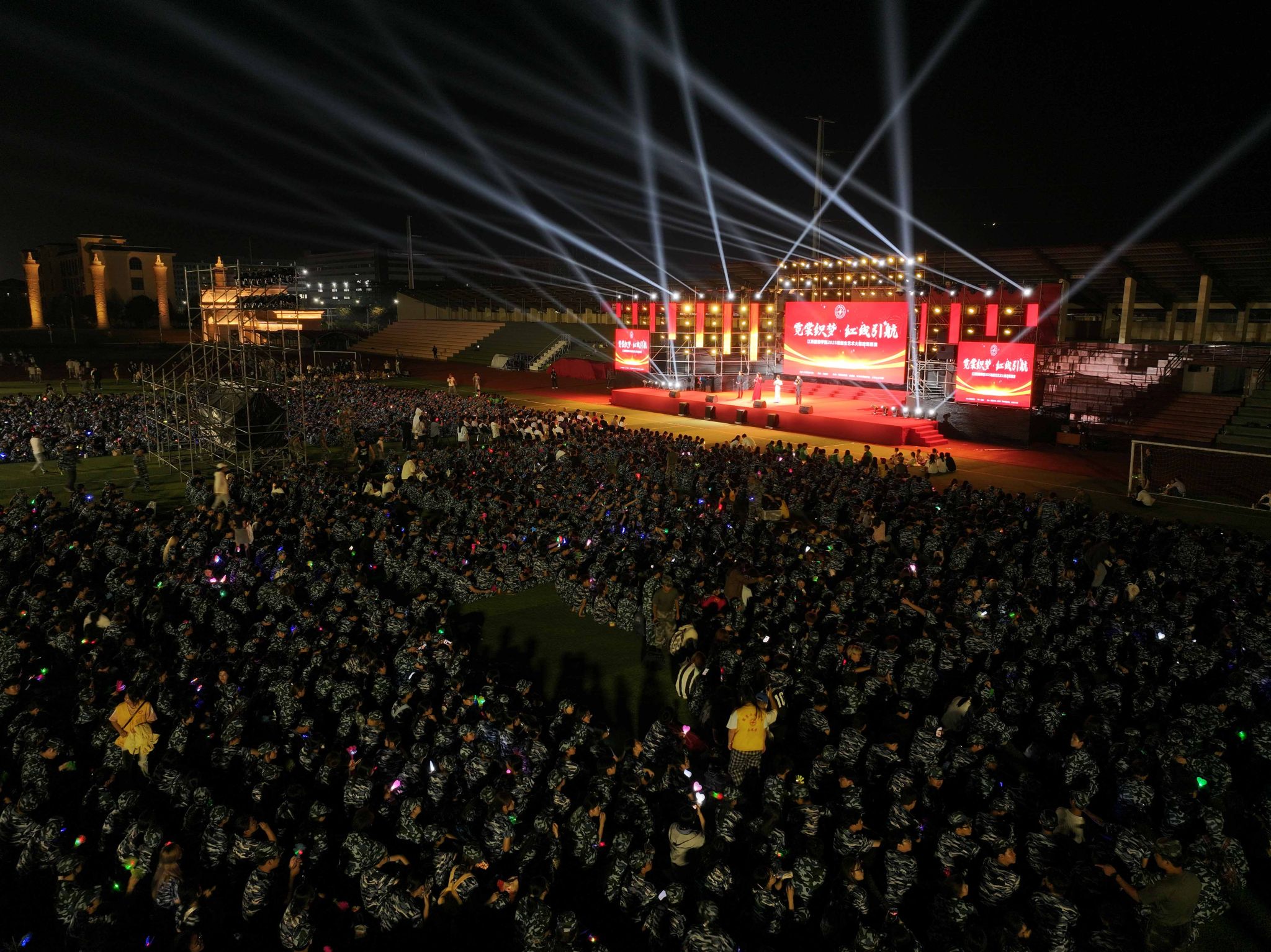新闻中心讯(文/丁晗艺 图/黄梓翔 颜冲 梅涛 刘毅 钟宏鹏)秋风送爽霓裳舞,青春向党正当时。10月16日晚,由校团委主办,党委宣传部、人民武装部、军事体育教学部协办的“霓裳织梦 红线引航”2025级新生艺术大思政课展演在田径场精彩上演。校长薛家宝,党委副书记、副校长李宝君,党委副书记唐新强,以及来自各学院、各部门的老师与2025级新生欢聚一堂,共同观看了这场融艺术审美与思政教育于一体的迎新盛宴。