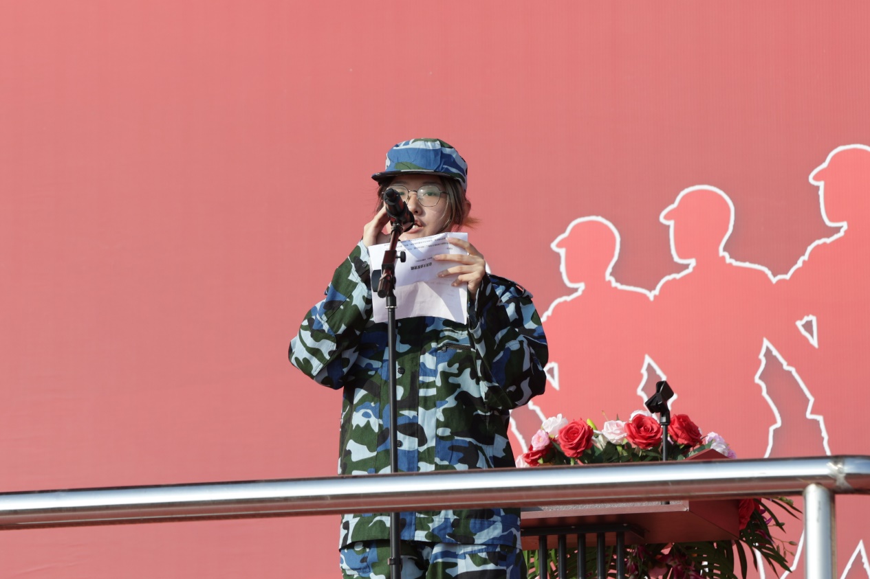 25级服装设计与工程2班余秋璇同学代表全体新生发言。她表示,将以饱满的热情和昂扬的斗志投入军训,虚心向教官学习,严格遵守纪律,克服困难、刻苦训练,在迷彩方阵中书写青春风采,不辜负学校与家长的期望。