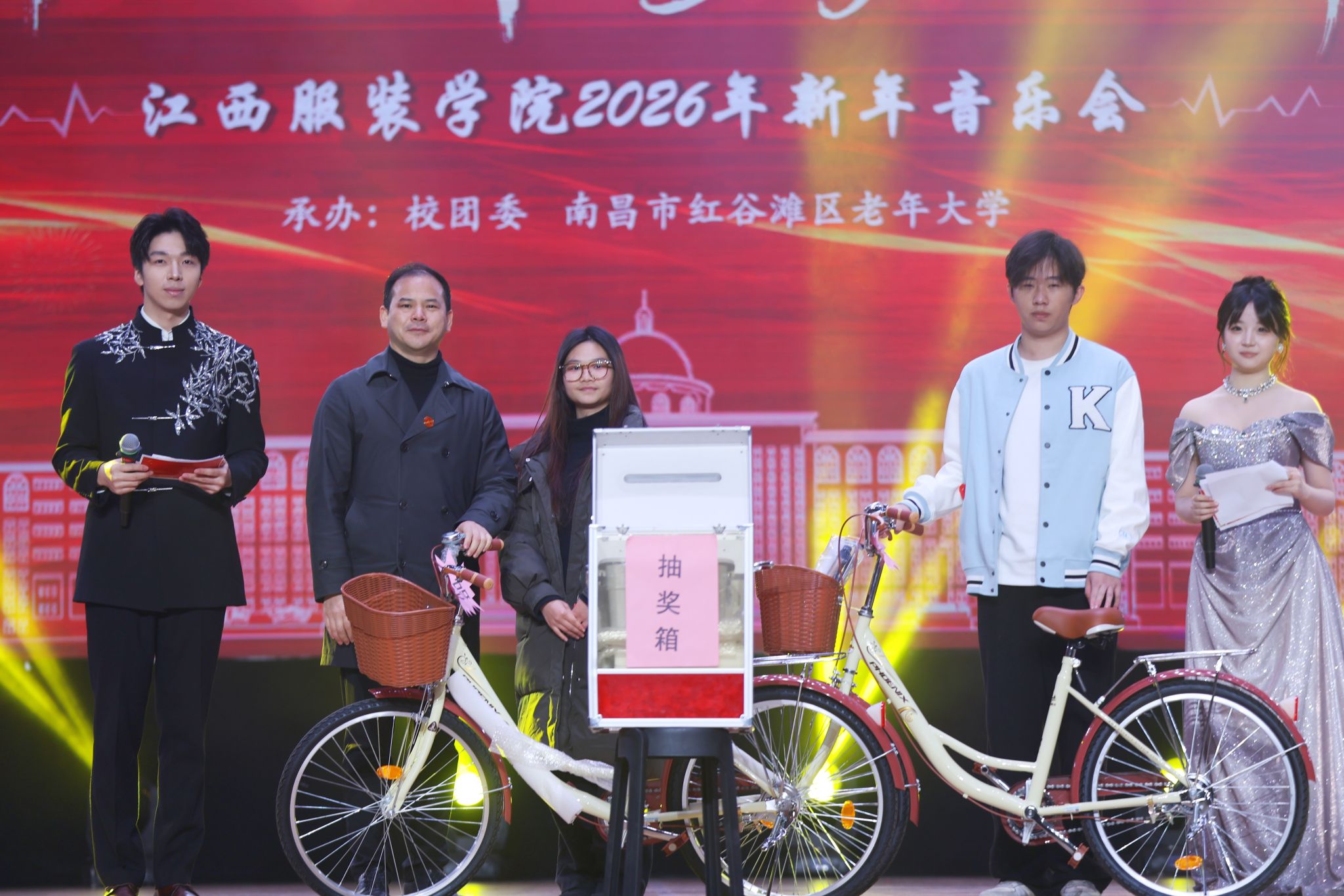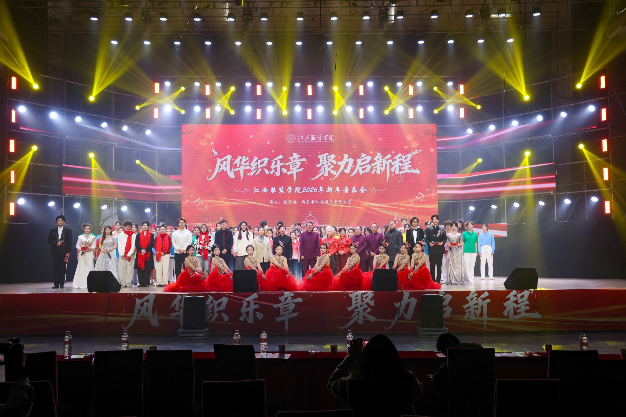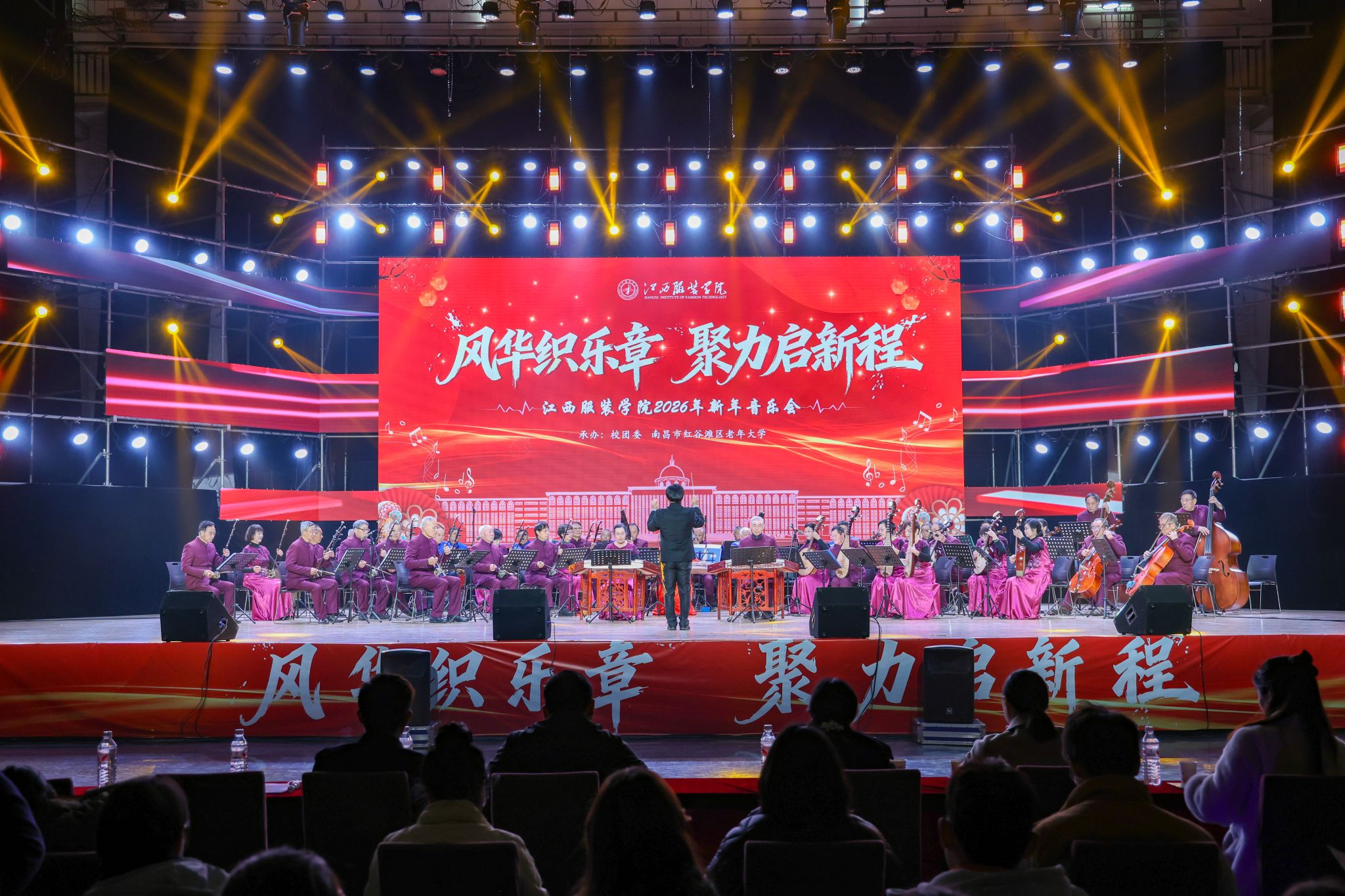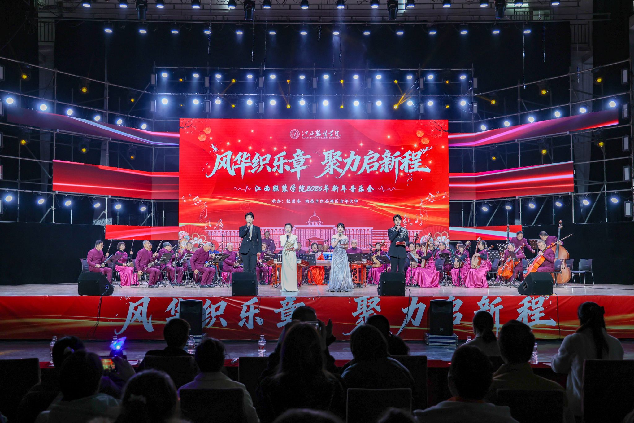 新闻中心讯(供稿/ 校团委)同心聚力开新岁,砥砺奋进赴新程。12月28日下午,江西服装学院2026年“风华织乐章,聚力启新程”新年音乐会在霓裳宫圆满举行。校党委书记、督导专员林井萍,党委副书记唐新强等在家校领导与3000余名师生欢聚一堂,共迎新年。本次演出特邀红谷滩区老干部民乐团助阵,为现场观众献上了一场精彩纷呈的视听盛宴。