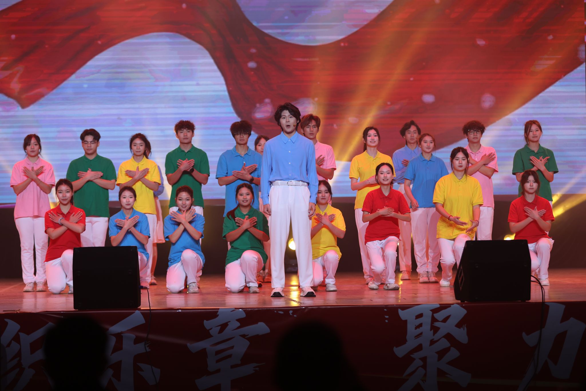 音乐会紧扣时代主题,以“乐忆初心岁启新程”“红韵传声情寄山河”“青春挺膺筑梦中华”三个篇章徐徐铺展,涵盖歌曲、舞蹈、走秀、朗诵、民乐合奏等多元表演形式,将传统文化底蕴与青春活力深度融合,全方位展现了江服师生昂扬向上的精神风貌与扎实的艺术素养。