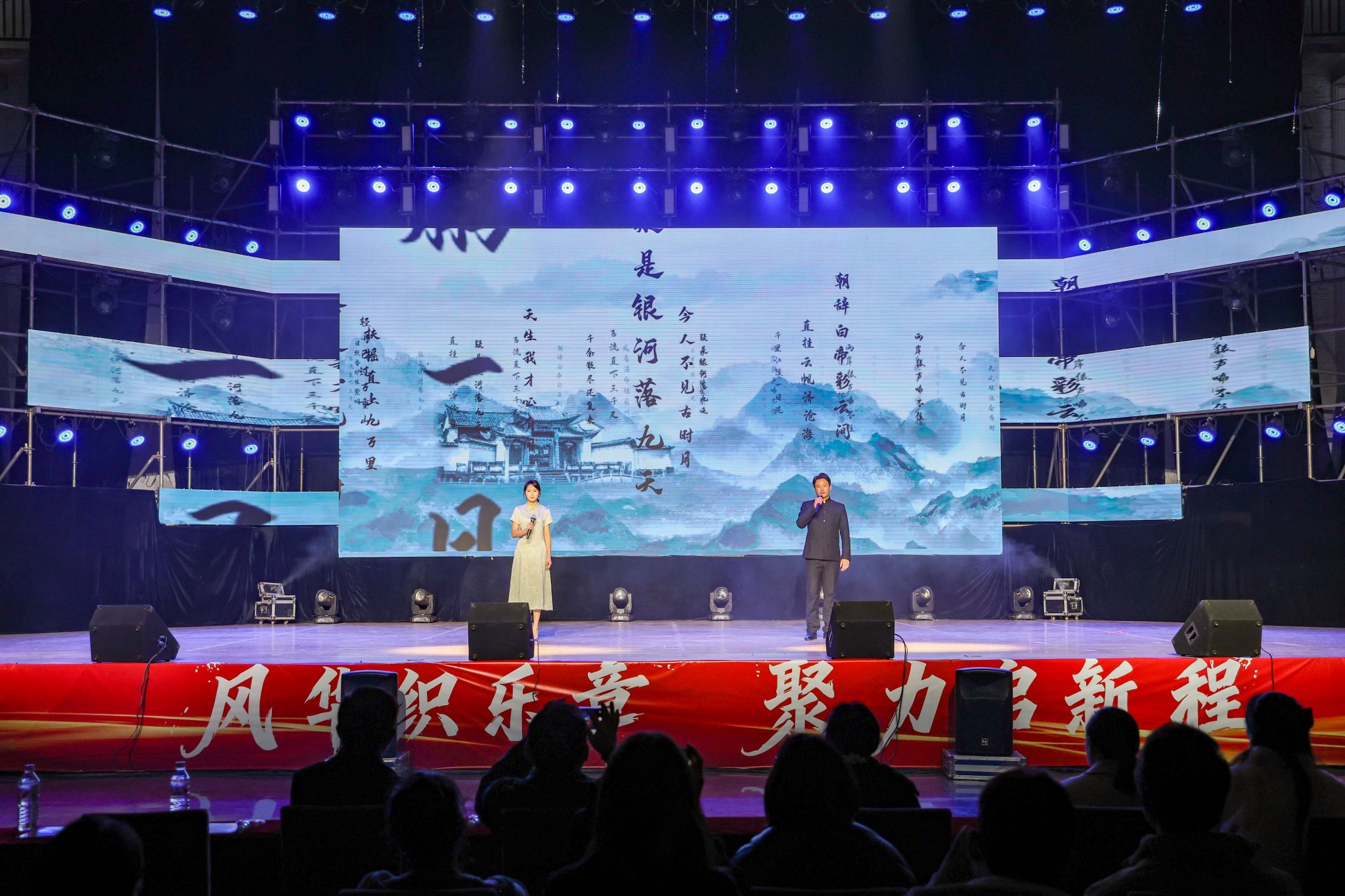 第二篇章“红韵传声情寄山河”聚焦家国情怀与青春风采。二胡齐奏《战马奔腾》弓弦翻飞、气势如虹,勾勒出沙场万马奔腾的壮阔景象;朗诵《如果没有李白》以声为舟,带领观众穿梭于盛唐诗意之中,语言温情且富有想象力;舞蹈《青春大中国》舞步铿锵、神情昂扬,展现出青春与祖国共成长的蓬勃气象;健美操《灯火里的中国》光影流转、身姿跃动,用活力与健美勾勒出温暖祥和的家国画卷;走秀《溯》步履生风,将传统服饰韵味与现代时尚元素完美融合,在T台上书写出文化自信的当代篇章。