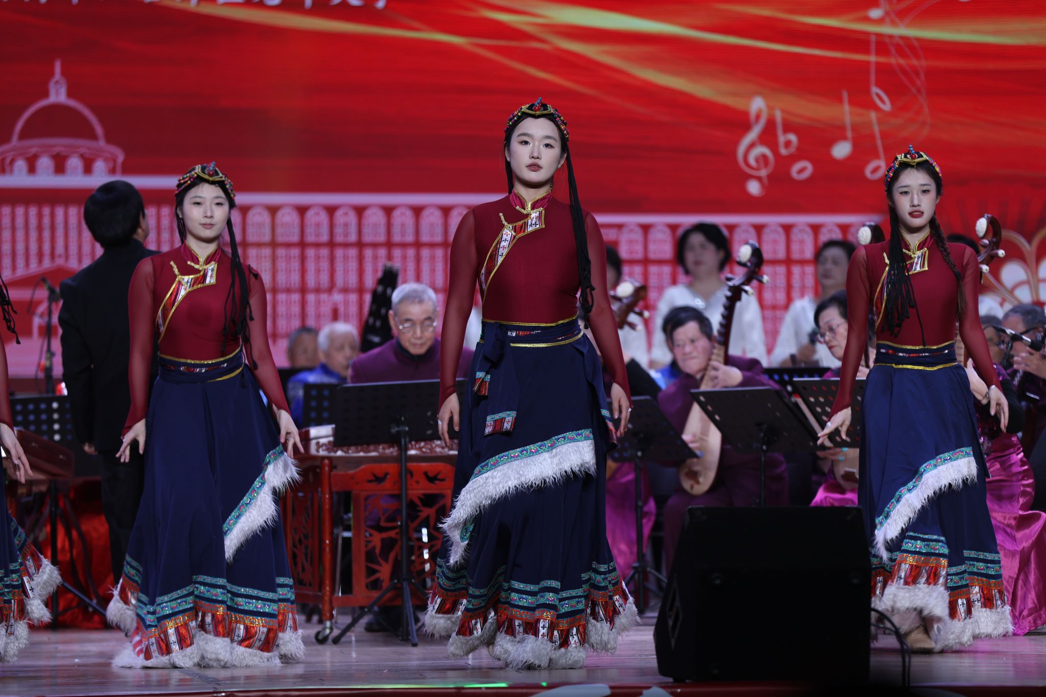 第一篇章“乐忆初心岁启新程”以悠扬民乐拉开帷幕。红谷滩区老年大学民乐团带来的民乐合奏《新春乐》节奏明快、暖意融融,瞬间点燃现场氛围;《乡行》乐声轻柔婉转,如清风拂过田野,勾勒出静谧悠远的乡间画卷;女子表演唱《梦回故郡》女声清婉灵动,一吟一唱间诉说深厚家国情怀;《边南风情》中,同学们身着傣族服饰翩翩起舞,与老艺术家的民乐演奏相得益彰,尽显浓郁民族风情;竹笛合奏《扬鞭催马运粮忙》笛声激越昂扬,将丰收的喜悦诠释得淋漓尽致;歌舞《洗衣歌》生动演绎出军民互助、藏汉同心的动人图景;民乐合奏《抗日战歌连奏》乐音铿锵有力,重温烽火岁月,激荡起深沉的民族精神。