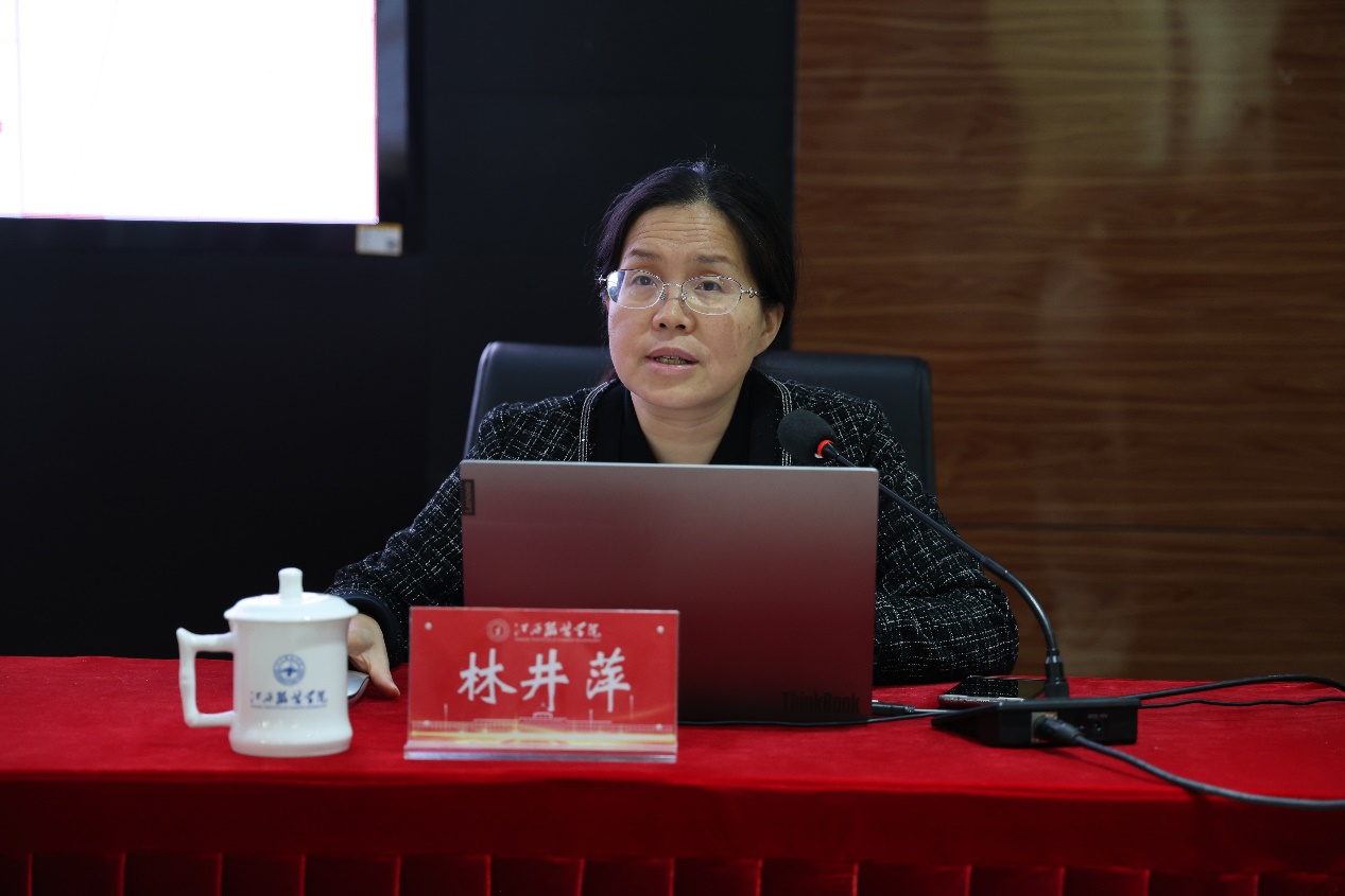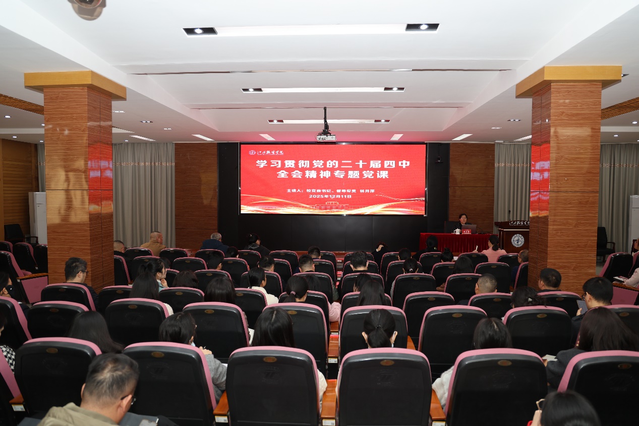 新闻中心讯(图文/万强)为深入学习贯彻党的二十届四中全会精神,强化党员及党外人士的思想引领与理论武装,12月11日上午,我校在行政楼一楼报告厅举行学习贯彻党的二十届四中全会精神专题党课。本次党课由校党委书记、督导专员林井萍同志主讲,机关党委全体党员、商学院教师党支部全体党员及党外代表人士参加学习。