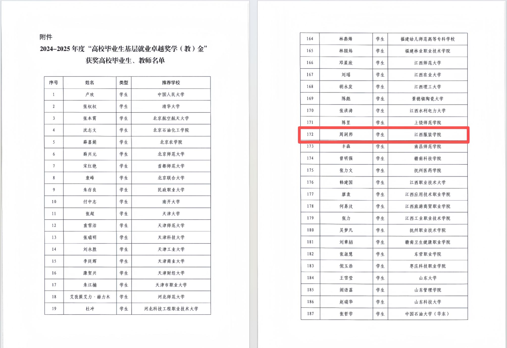 新闻中心讯(供稿/就业处)近日,从教育部传来喜讯,我校选送的2020届毕业生周润邦基层就业事迹,经江西省教育厅推荐,已成功通过评审,入选全国高校毕业生基层就业卓越奖,其事迹将作为典型案例由教育部进行宣传推广。此次入选,实现了我校在该高层次奖项上零的突破,学校也是江西省唯一获此殊荣的民办本科高校。